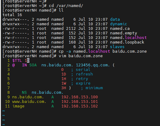 #进入/var/named/路径下,完全权限复制正向解析文件魔板named.localhost,然后编辑正向解析文件baidu.com.zone(文件里的@表示baidu.com.)