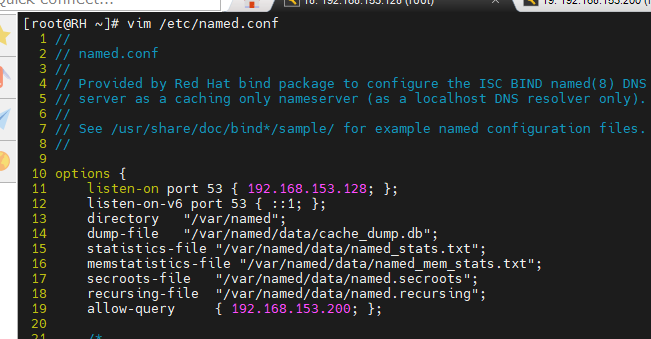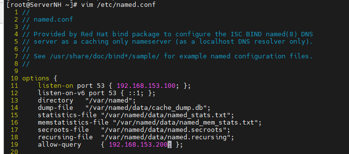 #编辑主配置文件named.conf;修改listen-on port 53的位置——允许监听的IP范围(可以写0.0.0.0或any,都表示所有IP;也可以写192.168.153.xxx网段);修改allow-query——允许谁查询(可以写any或指定ip)