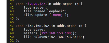 #编辑区域声明文件named.rfc1912.zones,模仿添加正向解析区域和反向解析区域;从服务器zone的区域名要与主服务器一致;修改type——声明服务器(master表示主服务器,slave表示从服务器);添加masters——主服务器指向谁;删除allow-update;file——从服务器的区域文件保存位置,在与主服务器区域文件同名前面添加slaves/