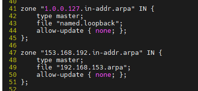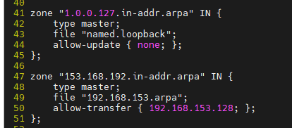 #编辑区域声明文件named.rfc1912.zones,修改之前的正向解析和反向解析区域;修改allow-update为allow-transfer,后面修改为从服务器ip