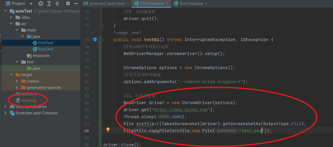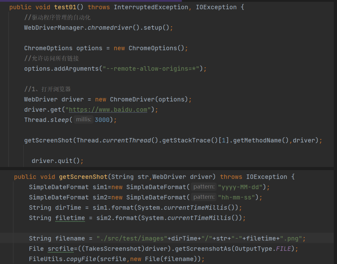 <dependency><groupId>commons-io</groupId><artifactId>commons-io</artifactId><version>2.6</version></dependency> ``` ``` File file = ((TakesScreenshot)webDriver).getScreenshotAs(OutputType.FILE);FileUtils.copyFile(file,new File(filename));可以指定目录: