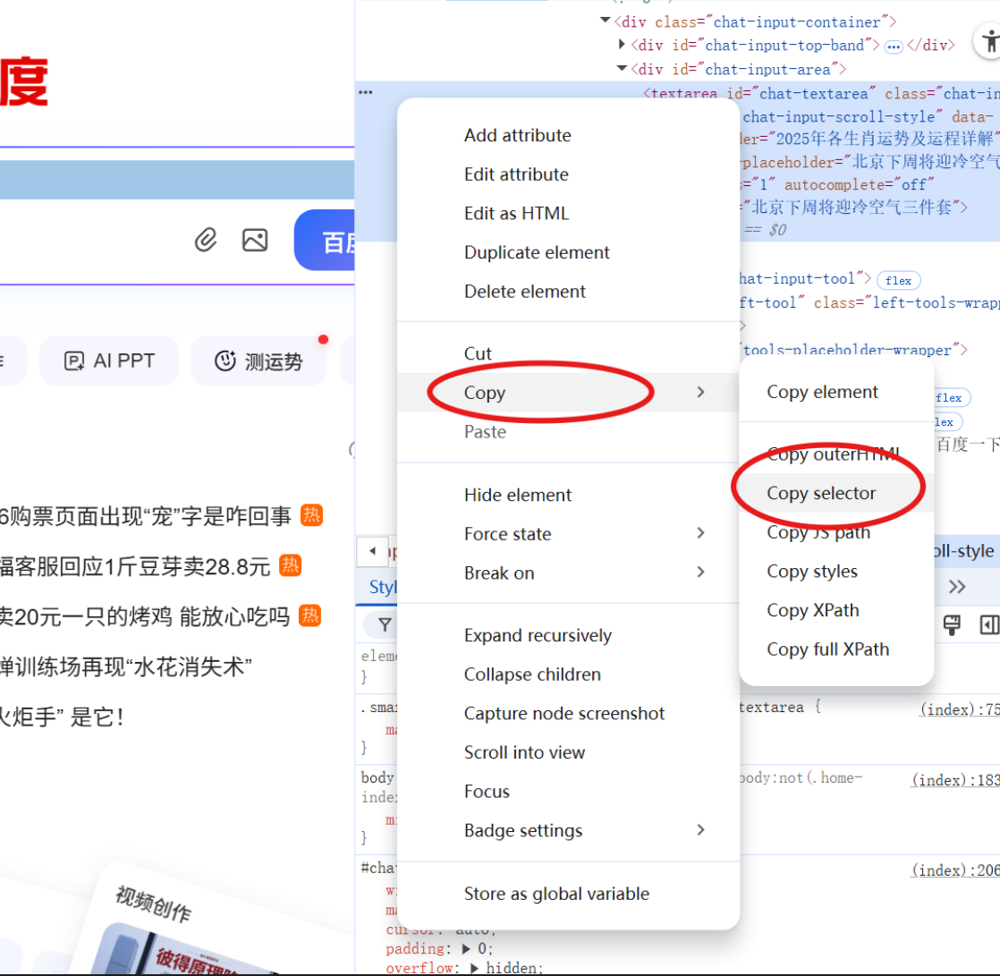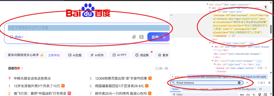 //使用css选择器也可以定位到输入框 driver.findElement(By.cssSelector("#chat-textarea")).sendKeys("迪丽热巴"); //4、找到"百度一下"按钮并点击 driver.findElement(By.cssSelector("#chat-submit-button")).click();
