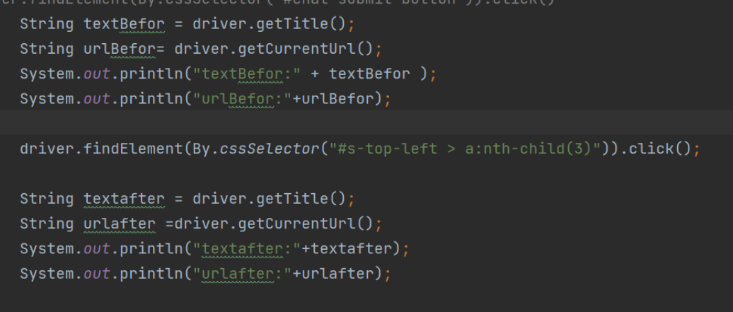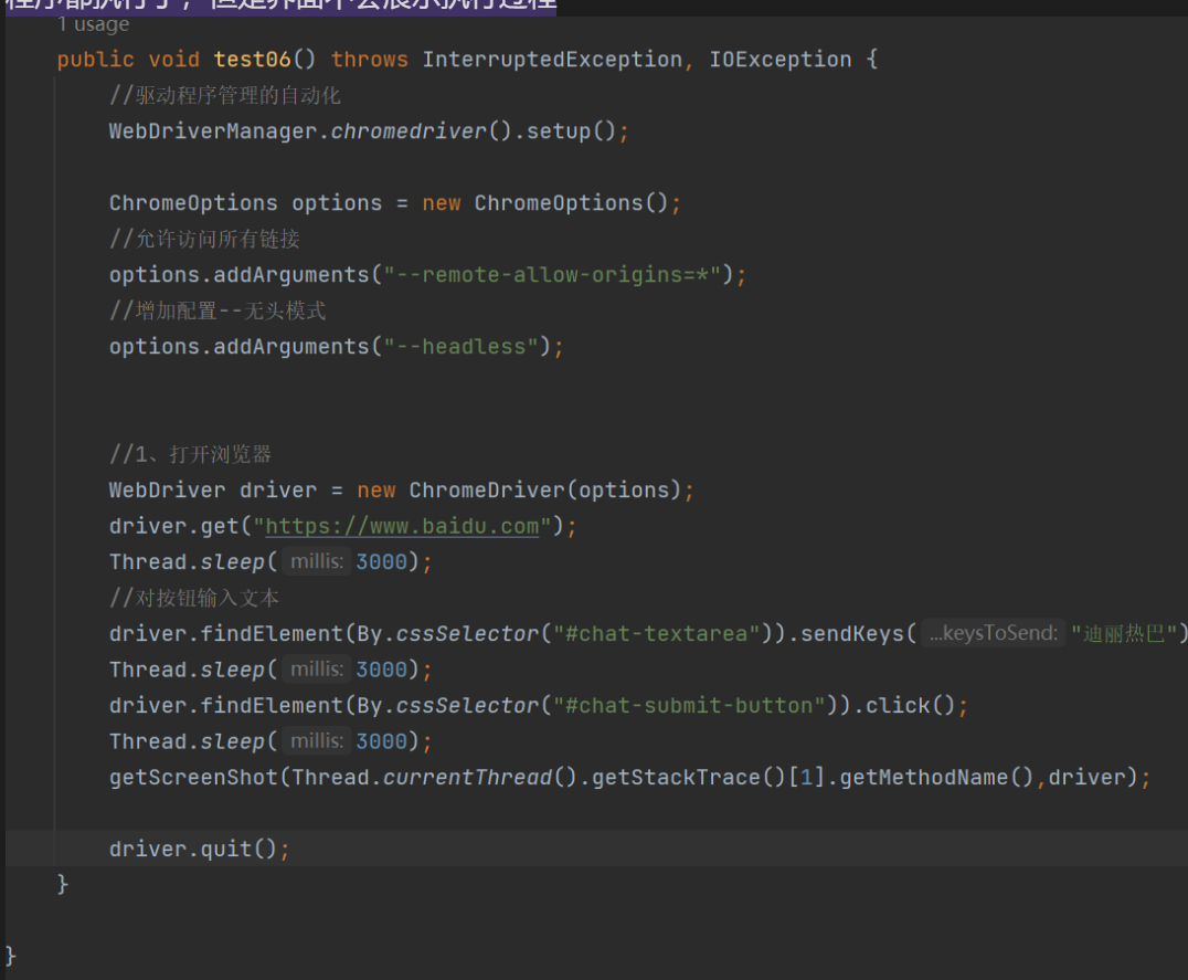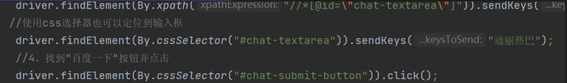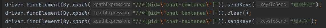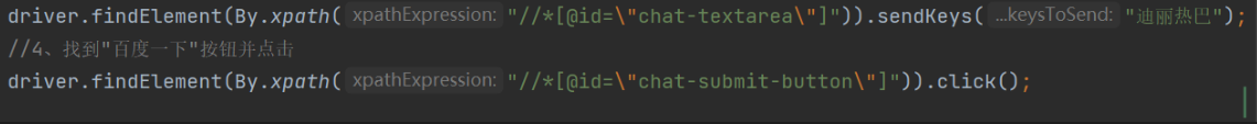 driver.findElement(By.xpath("//*[@id=\"chat-textarea\"]")).sendKeys("迪丽热巴"); //4、找到"百度一下"按钮并点击 driver.findElement(By.xpath("//*[@id=\"chat-submit-button\"]")).click();