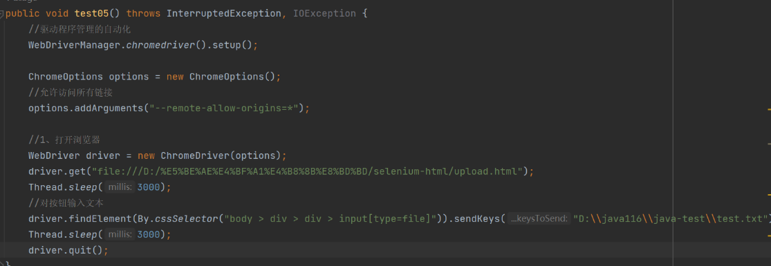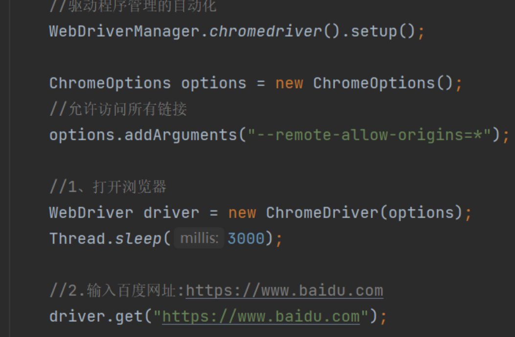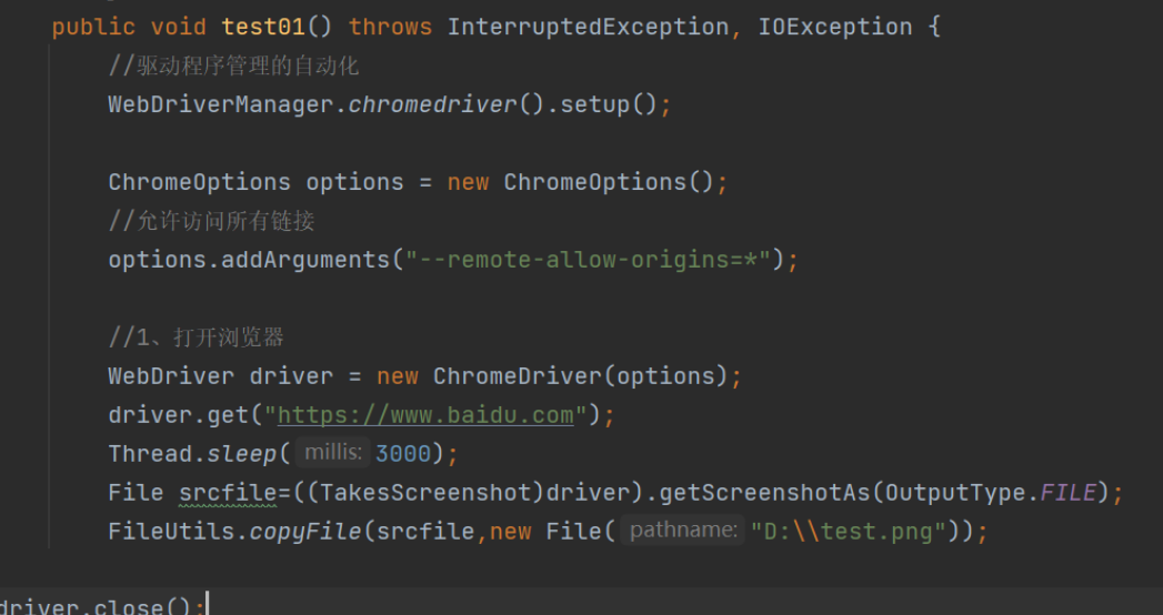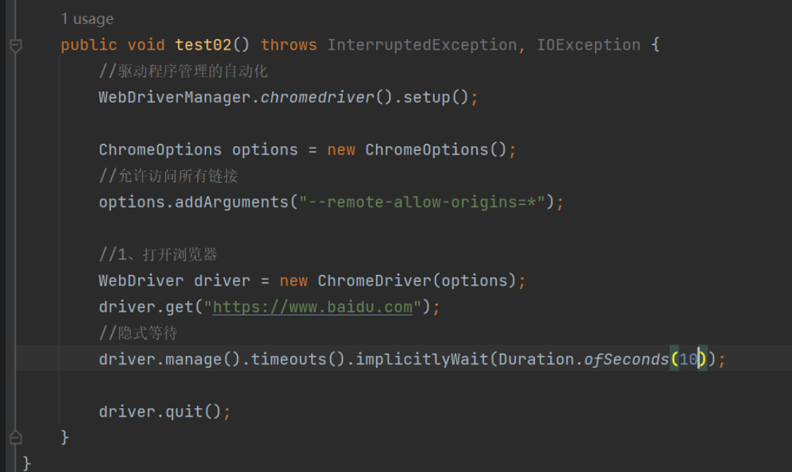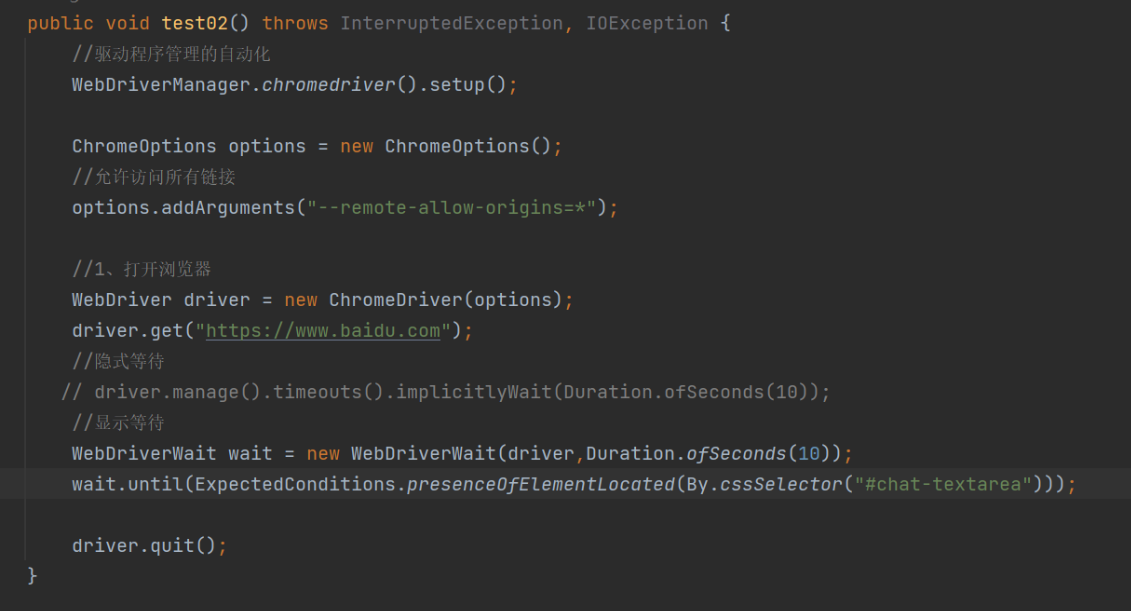 public void test01() throws InterruptedException { //驱动程序管理的自动化 WebDriverManager.chromedriver().setup(); ChromeOptions options = new ChromeOptions(); //允许访问所有链接 options.addArguments("--remote-allow-origins=*"); //1、打开浏览器 WebDriver driver = new ChromeDriver(options); driver.manage().window().maximize(); Thread.sleep(3000); driver.manage().window().minimize(); Thread.sleep(3000); driver.manage().window().fullscreen(); Thread.sleep(3000); driver.manage().window().setSize(new Dimension(100, 100)); Thread.sleep(3000); driver.close(); } }