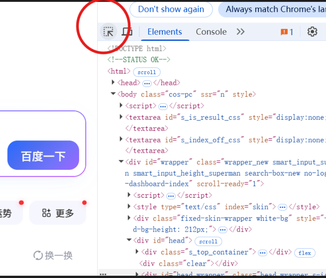 元素定位器,点击,然后就可以在前端页面寻找源码元素