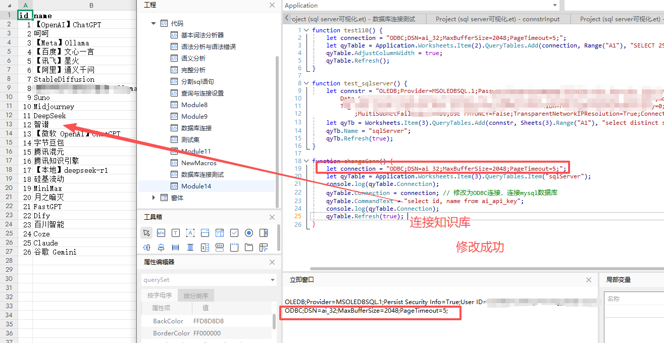 function changeConn() {let connection = "ODBC;DSN=ai_32;MaxBufferSize=2048;PageTimeout=5;";let qyTable = Application.Worksheets.Item(3).QueryTables.Item("sqlServer");console.log(qyTable.Connection);qyTable.Connection = connection; // 修改为ODBC连接,连接mysql数据库qyTable.CommandText = "select id, name from ai_api_key";console.log(qyTable.Connection);qyTable.Refresh(true);