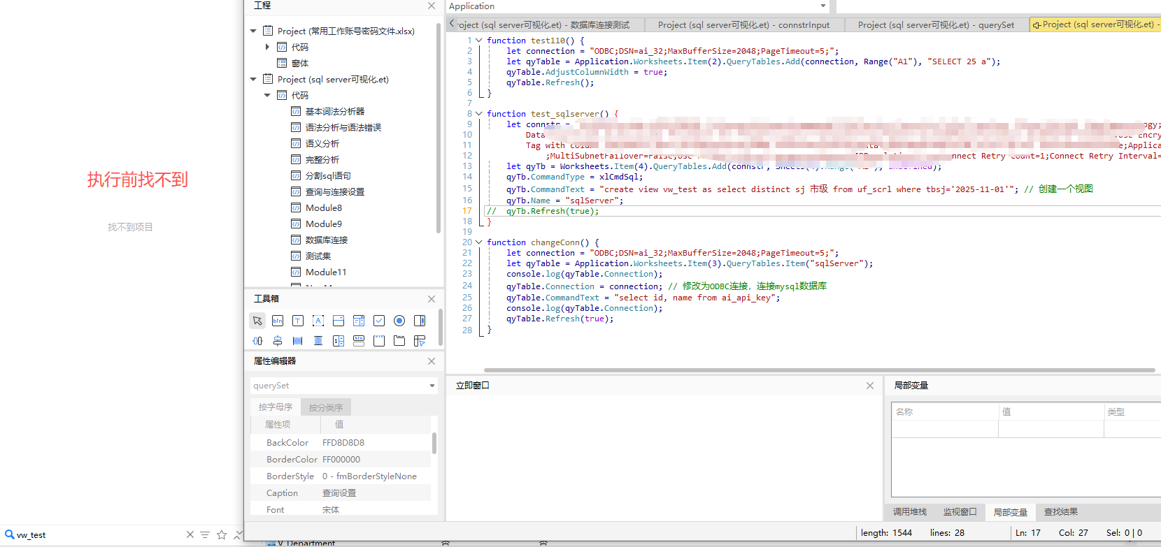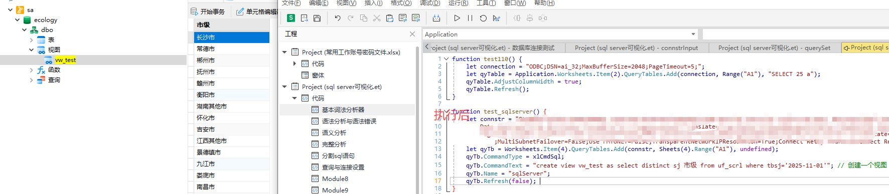 function test_sqlserver() {let connstr = "你的连接字符串";let qyTb = Worksheets.Item(4).QueryTables.Add(connstr, Sheets(4).Range("A1"), undefined);qyTb.CommandType = xlCmdSql;qyTb.CommandText = "create view vw_test as select distinct sj 市级 from uf_scrl where tbsj='2025-11-01'"; // 创建一个视图qyTb.Name = "sqlServer";qyTb.Refresh(false); // 这里会抛出异常,因为没有数据返回给工作表,不过视图可以成功创建
