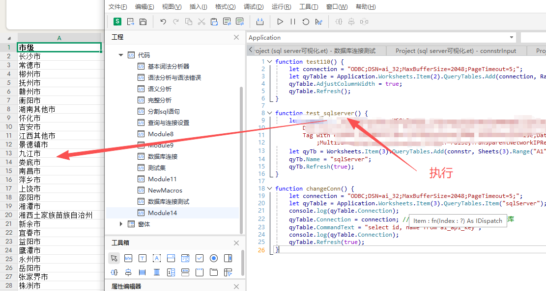 function test_sqlserver() {let connstr = "OLEDB;Provider=MSOLEDBSQL.1;Password=********;Persist Security Info=True;User ID=****;Initial Catalog=*****;\Data Source=***********;Use Procedure for Prepare=1;Auto Translate=True;Packet Size=4096;Workstation ID=**********;Use Encryption for Data=False;\Tag with column collation when possible=False;MARS Connection=False;DataTypeCompatibility=0;Trust Server Certificate=False;Application Intent=READWRITE\;MultiSubnetFailover=False;Use FMTONLY=False;TransparentNetworkIPResolution=True;Connect Retry Count=1;Connect Retry Interval=10";let qyTb = Worksheets.Item(3).QueryTables.Add(connstr, Sheets(3).Range("A1"), "select distinct sj 市级 from uf_scrl where tbsj='2025-11-01'");qyTb.Name = "sqlServer";qyTb.Refresh(true);