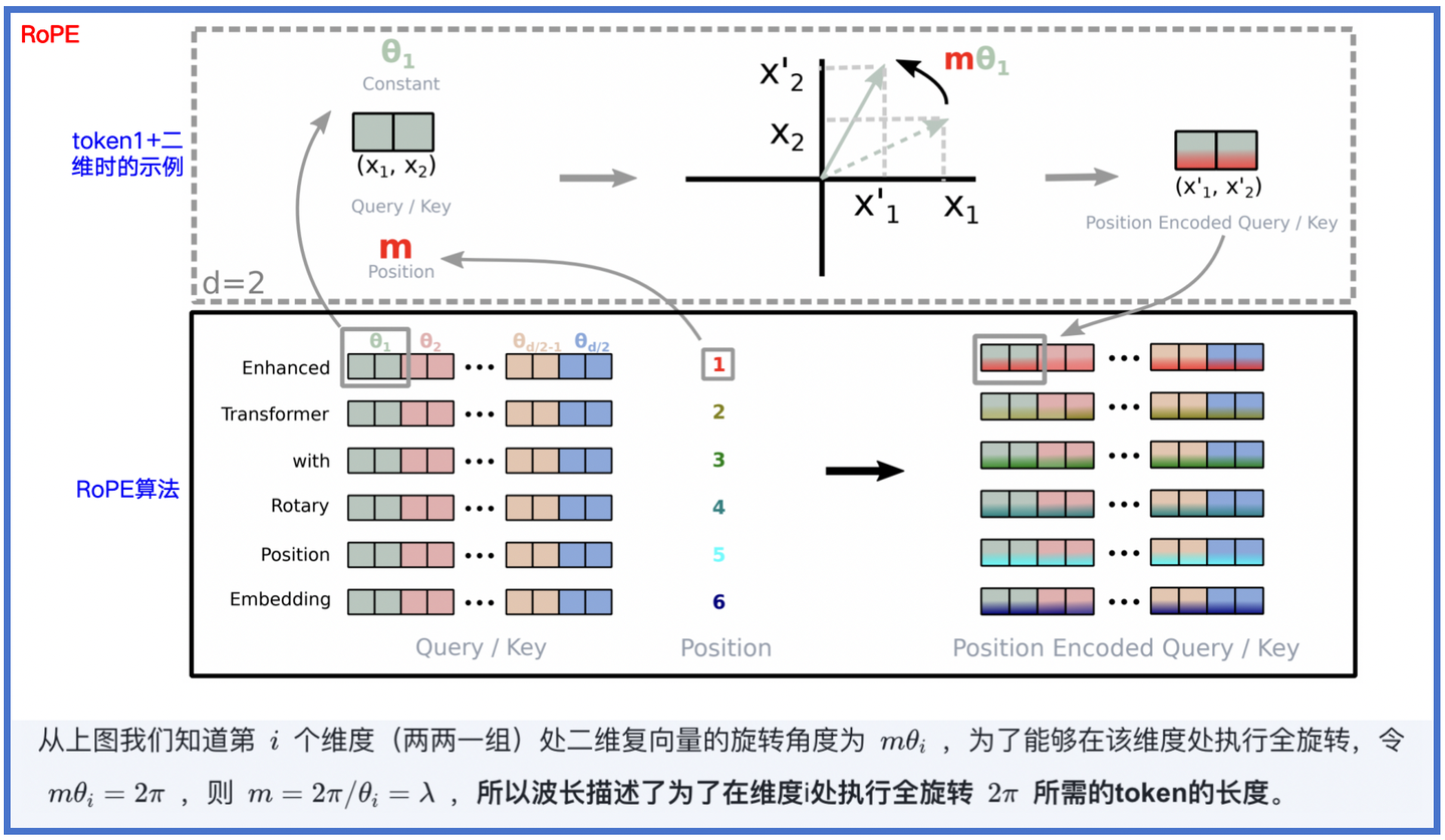 - 波长可描述为:在维度i处嵌入的旋转位置执行全旋转2π所需的token长度。