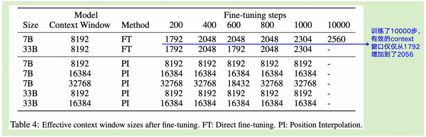PI(位置插值)是基于旋转位置编码RoPE进行改进,优化了外推性的问题:使用RoPE,以长度为L训练完成模型后,当输入超过L会发生性能剧烈下降,一些论文提出可以通过给模型喂一些长度大于L的输入来微调模型,进而逐步将原始窗口长度扩大,但其代价和成效不佳(实验结果如下图4-1)。
