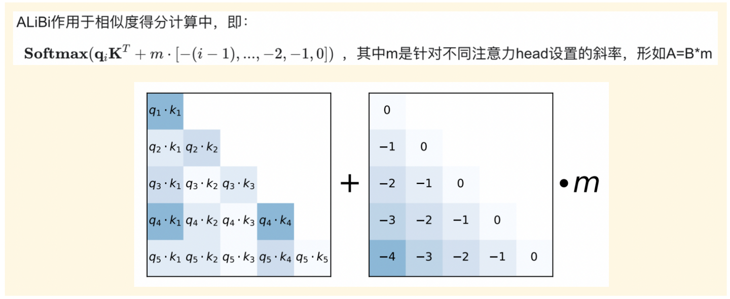 **思路:**ALiBi(基于线性偏差的注意力机制) 不向word embedding中添加positional embedding,而是"根据token之间的距离给 attention score 加上一个预设好的偏置矩阵",即直接引入相对位置。