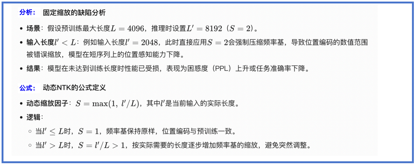 在NTK中 S=\frac{L’}{L} ,在推理时,这里的 S 是固定的( L’ 是固定的扩展上下文大小, L 是预训练时候的最大上下文长度)。但是,这可能导致推理的序列长度 <L 时会损失模型性能。