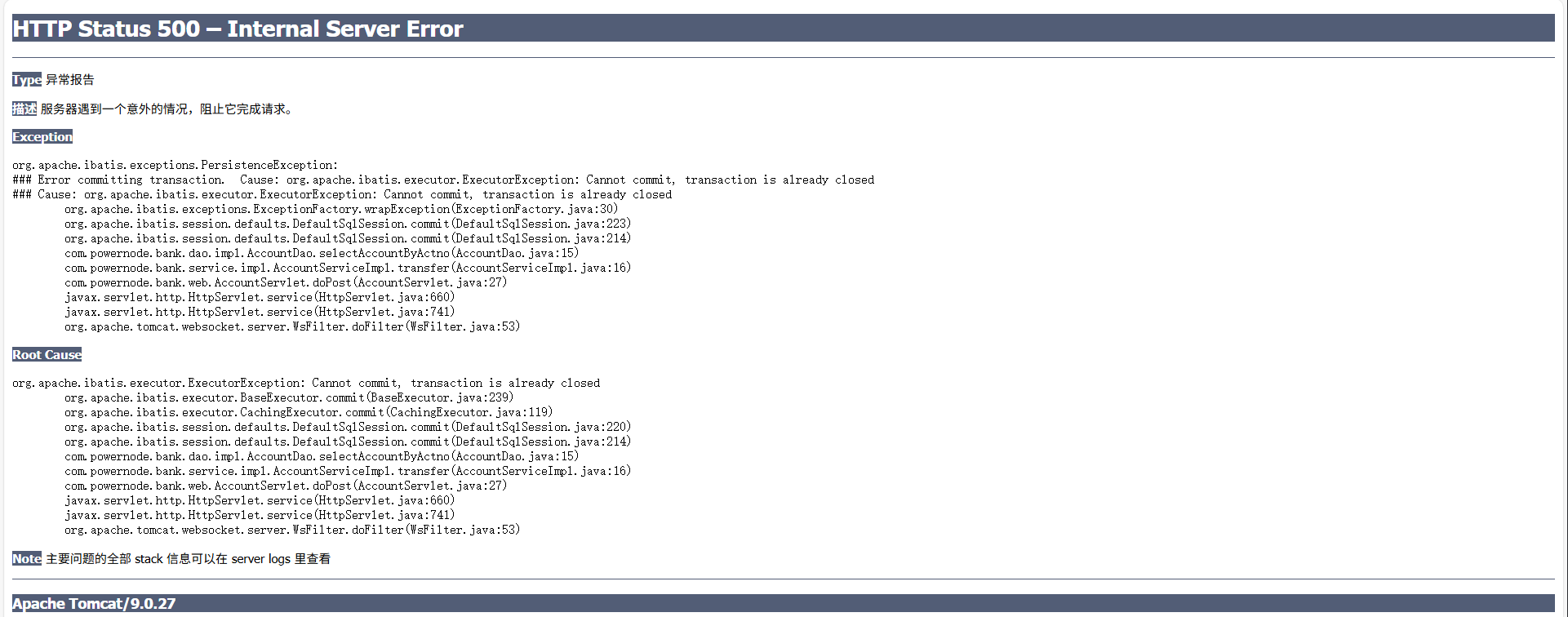开发银行转账核心功能时,前端发起转账请求后直接返回 500 错误,服务器日志关键信息如下: