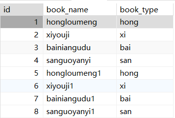 CREATE TABLE `book` (`id` int NOT NULL,`book_name` varchar(32) DEFAULT NULL,`book_type` varchar(32) DEFAULT NULL,PRIMARY KEY (`id`)