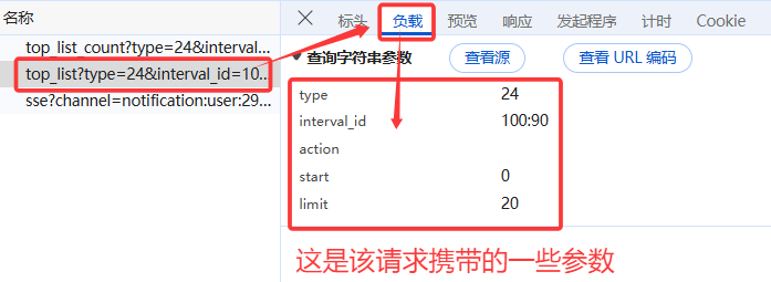 可见此时能看到请求的url、请求方式为GET、携带的参数。