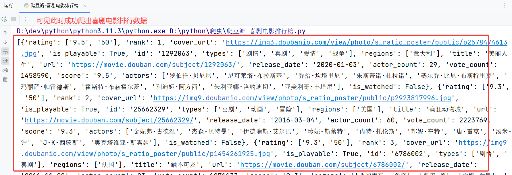我们已经将喜剧片排行榜的数据爬出来了,可以存到一个文档里。这样我们就有了这些数据,以后可以作为数据建模的数据源,供我们使用。