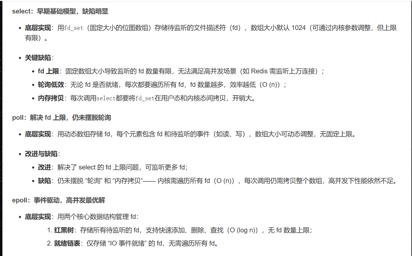 三者均是操作系统提供的 “IO 事件监听接口”,核心目标相同,但实现方式不同,导致性能差异巨大,epoll 是当前 Linux 系统的最优选择。