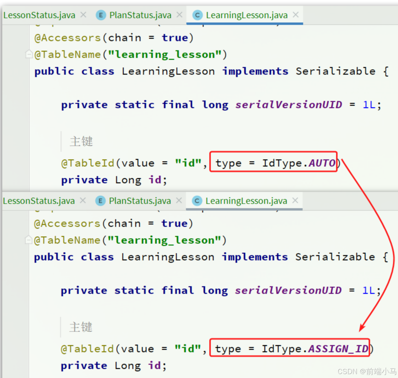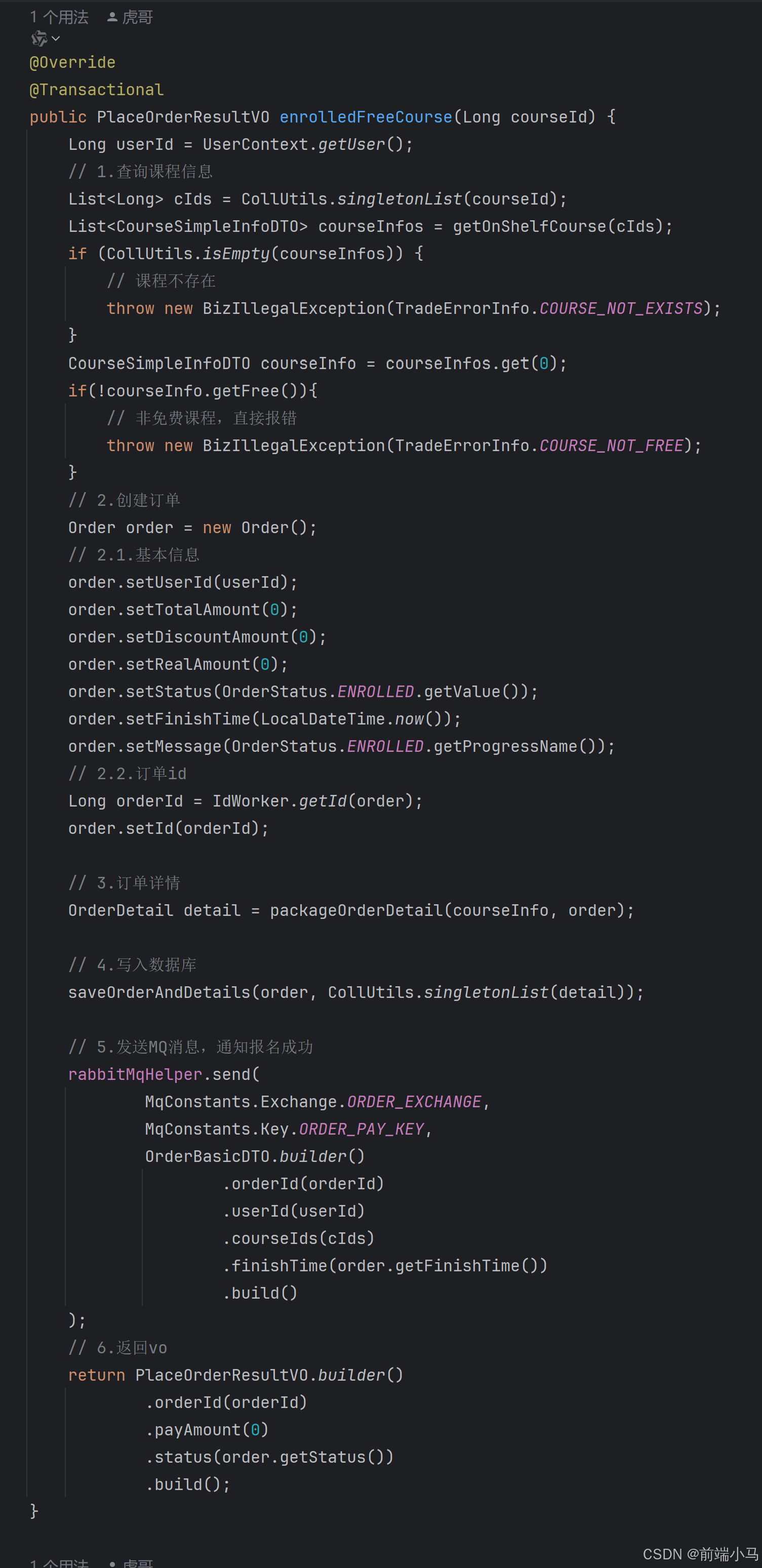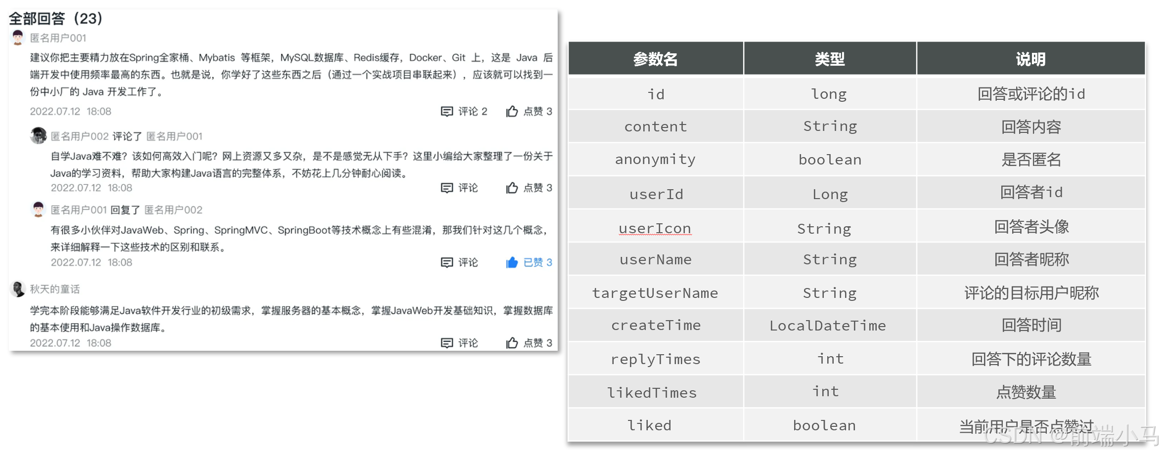 tj-learning中的类com.tianji.learning.mq.LikeTimesChangeListener:@Slf4j @Component @RequiredArgsConstructor public class LikeTimesChangeListener {private final IInteractionReplyService replyService;@RabbitListener(bindings = @QueueBinding(value = @Queue(value = "qa.liked.times.queue", durable = "true"),exchange = @Exchange(name = MqConstants.Exchange.LIKE_RECORD_EXCHANGE, type = ExchangeTypes.TOPIC),key = QA_LIKED_TIMES_KEY))public void listenReplyLikedTimesChange(List<LikeTimesDto> likeTimesDto) {log.debug("监听到回答或评论的点赞数变更");List<InteractionReply> list = new ArrayList<>(likeTimesDto.size());for (LikeTimesDto dto : likeTimesDto) {InteractionReply r = new InteractionReply();r.setId(dto.getBizId());r.setLikedTimes(dto.getLikeTimes());list.add(r);}replyService.updateBatchById(list);} }