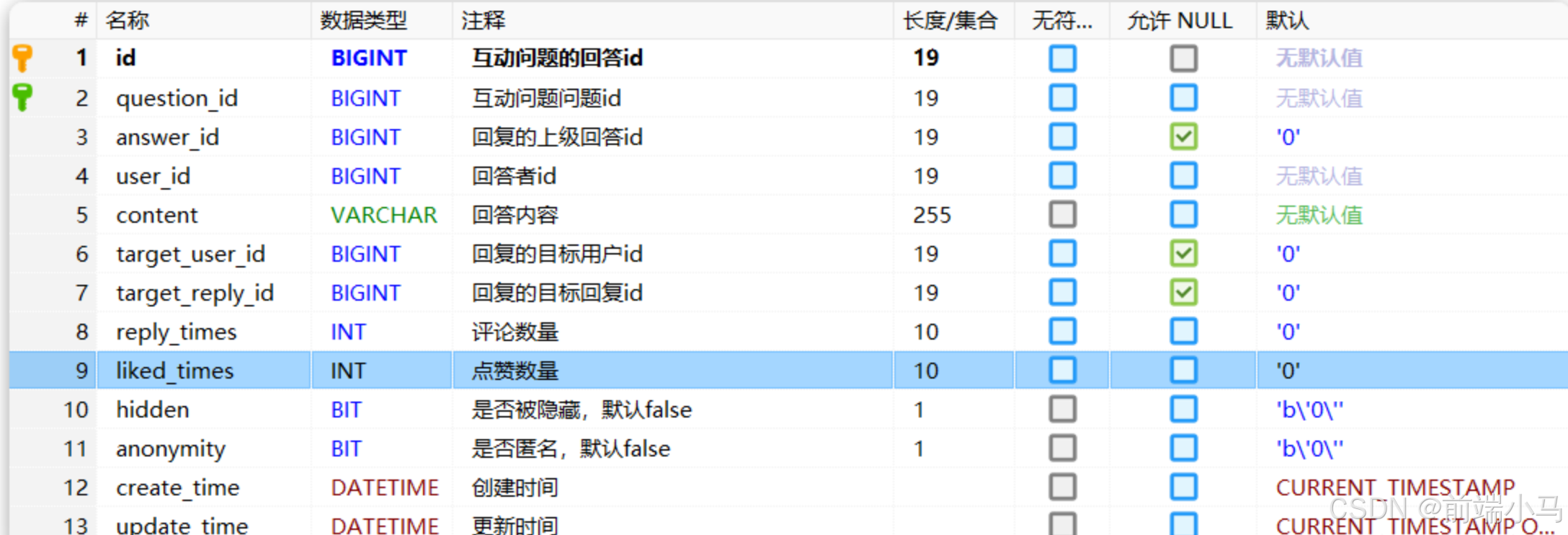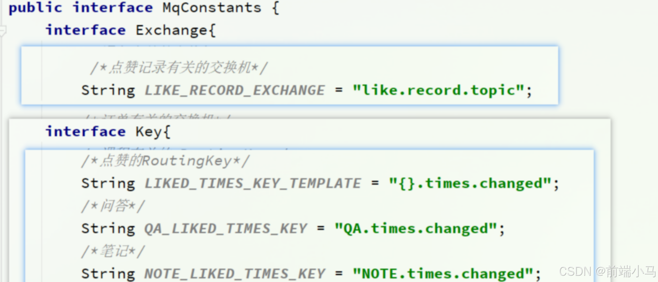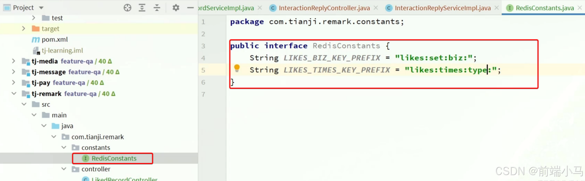 public interface RedisConstants {/*给业务点赞的用户集合的KEY前缀,后缀是业务id*/String LIKE_BIZ_KEY_PREFIX = "likes:set:biz:";/*业务点赞数统计的KEY前缀,后缀是业务类型*/String LIKES_TIMES_KEY_PREFIX = "likes:times:type:"; }