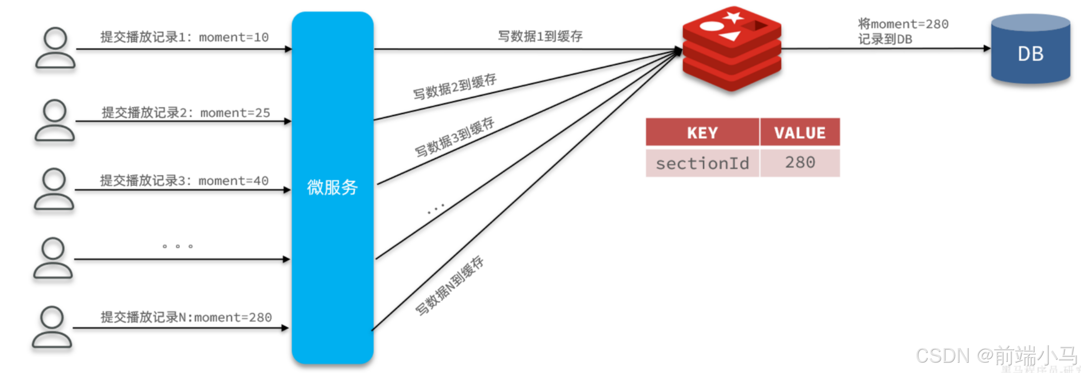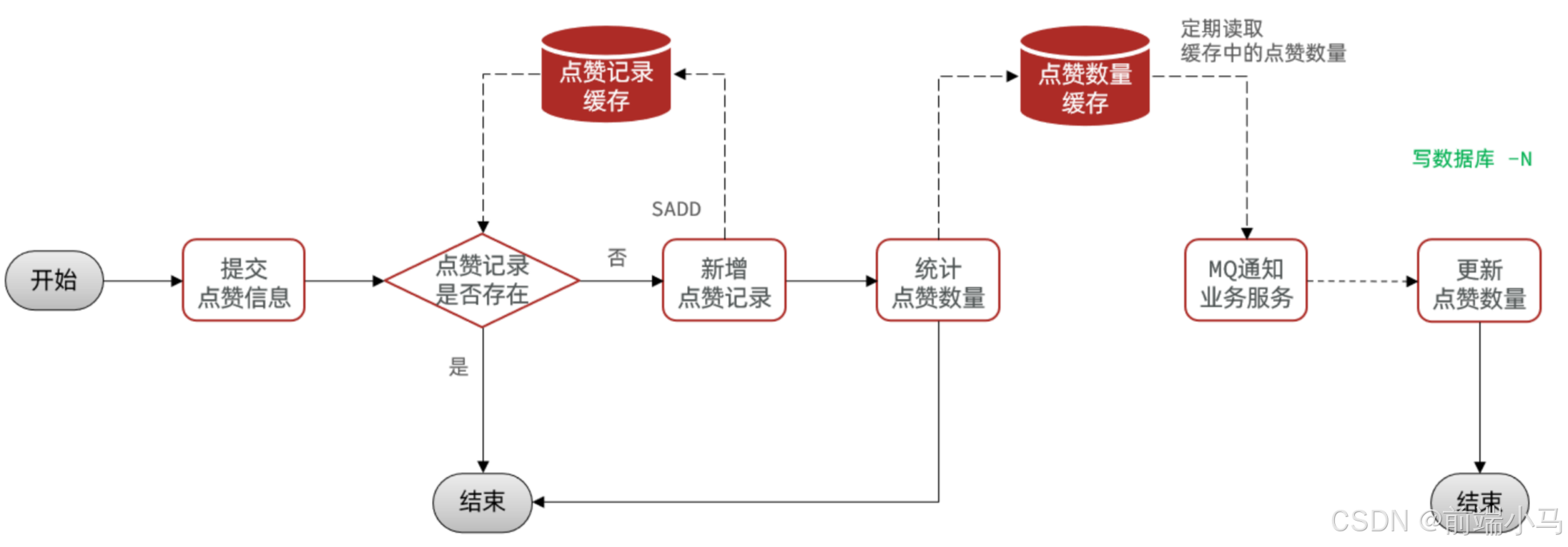 当用户对某个业务点赞时,我们统计点赞总数,并将其缓存在Redis中。这样一来在一段时间内,不管有多少用户对该业务点赞(热点业务数据,比如某个微博大V),都只在Redis中修改点赞总数,无需修改数据库。