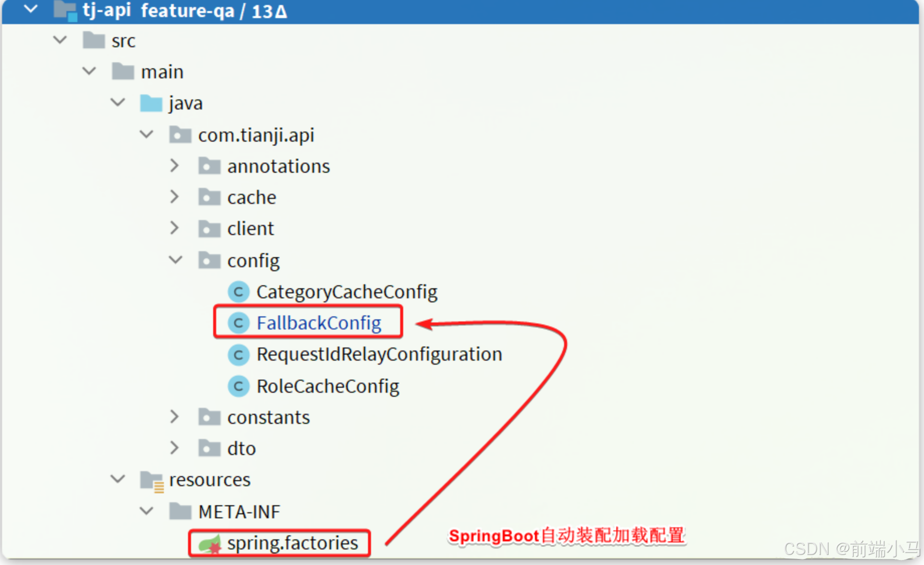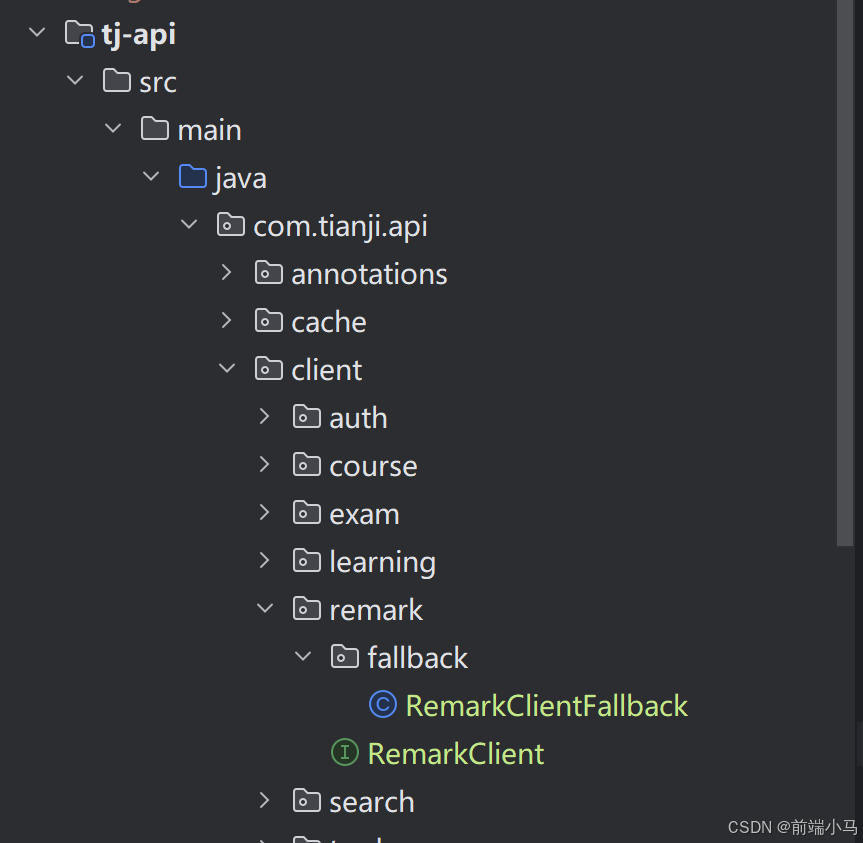 RemarkClientFallback是定义在tj-api的com.tianji.api包,由于每个微服务扫描包不一致。因此其它引用tj-api的微服务是无法通过扫描包加载到这个类的。我们需要通过SpringBoot的自动加载机制来加载这些fallback类: