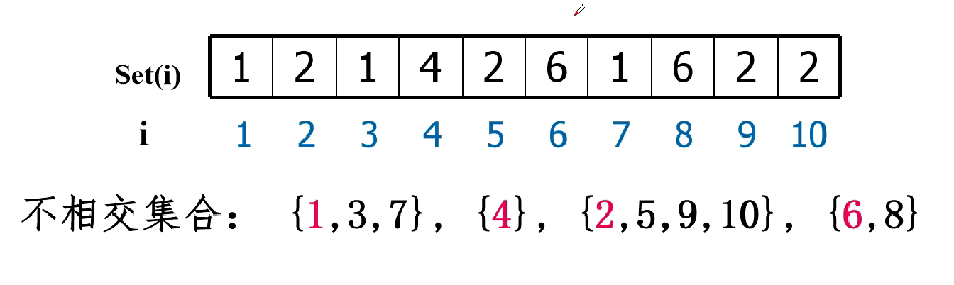 假设一共有十个人(数字表示人名),我们把他们分为四个班级(上图所示的不相交集合),如何让去标记这个班呢?