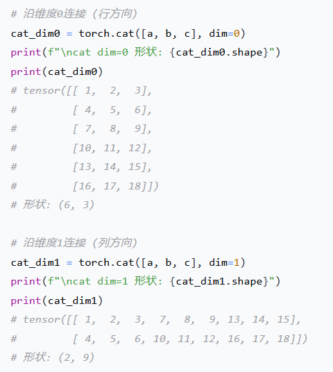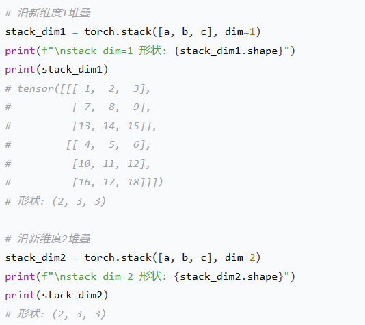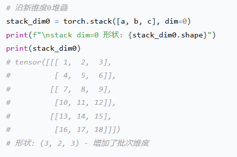 # 创建几个相同形状的张量 a = torch.tensor([[1, 2, 3],[4, 5, 6]])b = torch.tensor([[7, 8, 9],[10, 11, 12]])c = torch.tensor([[13, 14, 15],[16, 17, 18]])