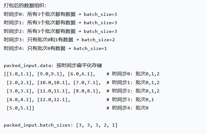 可视化打包过程:时间步: 0 1 2 3 序列1: [[1,10]] --> [[2,20]] --> [[3,30]] --> [[4,40]] 序列2: [[5,50]] --> [[6,60]] --> [[7,70]] --> (结束) 序列3: [[8,80]] --> [[9,90]] --> (结束) (结束)打包后的data: 时间步0: [[1,10], [5,50], [8,80]] (3个序列) 时间步1: [[2,20], [6,60], [9,90]] (3个序列) 时间步2: [[3,30], [7,70]] (2个序列) 时间步3: [[4,40]] (1个序列)batch_sizes: [3, 3, 2, 1]
