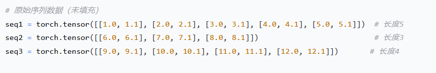 原始三维序列形状: torch.Size([3, 4, 2]) 原始序列: tensor([[[ 1., 10.],[ 2., 20.],[ 3., 30.],[ 4., 40.]],[[ 5., 50.],[ 6., 60.],[ 7., 70.],[ 0., 0.]],[[ 8., 80.],[ 9., 90.],[ 0., 0.],[ 0., 0.]]]) 序列长度: tensor([4, 3, 2])
