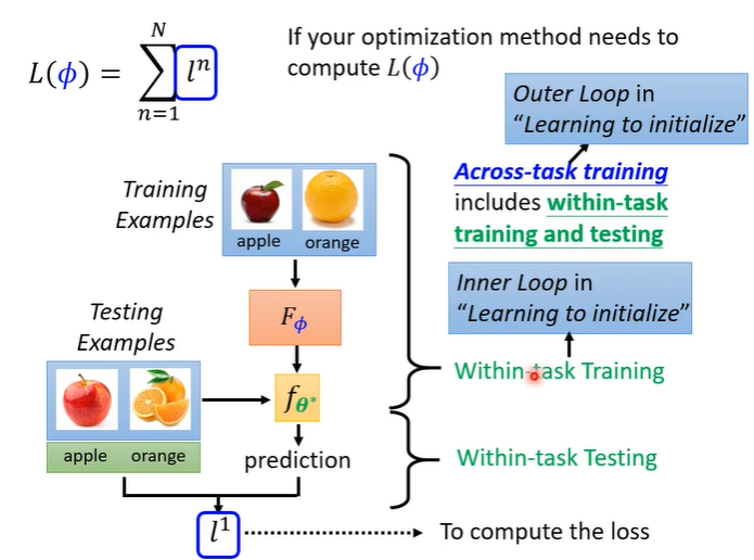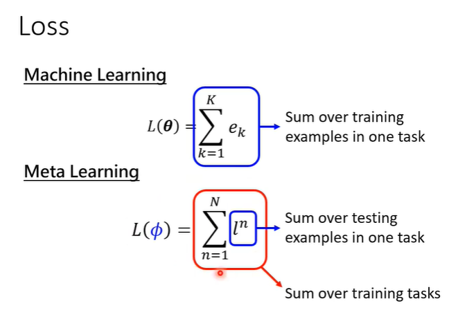 在machine learning中,loss函数的值L是用一个任务的所有测试资料算出来的,在meta learning中,l是某个任务里的所有测试资料算出来的,而loss函数的值L是所有任务的l算出来的。