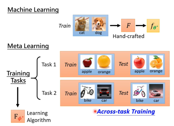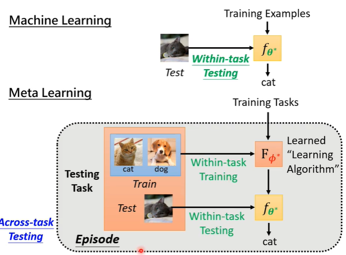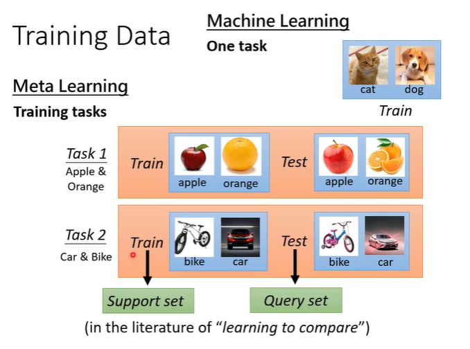 在machine learning中,是以某一个训练资料进行训练,在meta learning中,是以训练任务进行训练,每个训练任务都有训练资料和测试资料。