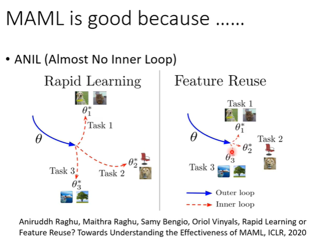 MAML会好的原因,有两种假设,第一个是MAML找到的initial参数是很厉害的参数,可以让learning algorithm快速找到每个任务上的好参数。另一个假设是MAML找到的initial参数本来就跟每个任务上最终好的结果非常接近。