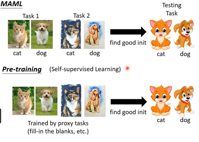 在学习self supervised learning时,是有一堆没有标注的资料,用proxy task去训练。会进行pre-training,结果是好的就用在测试任务上。对meta learning来说,在这些训练任务上找一个好的initialization,在这些任务上都有好的结果,也许就可以transfer到testing的任务上。