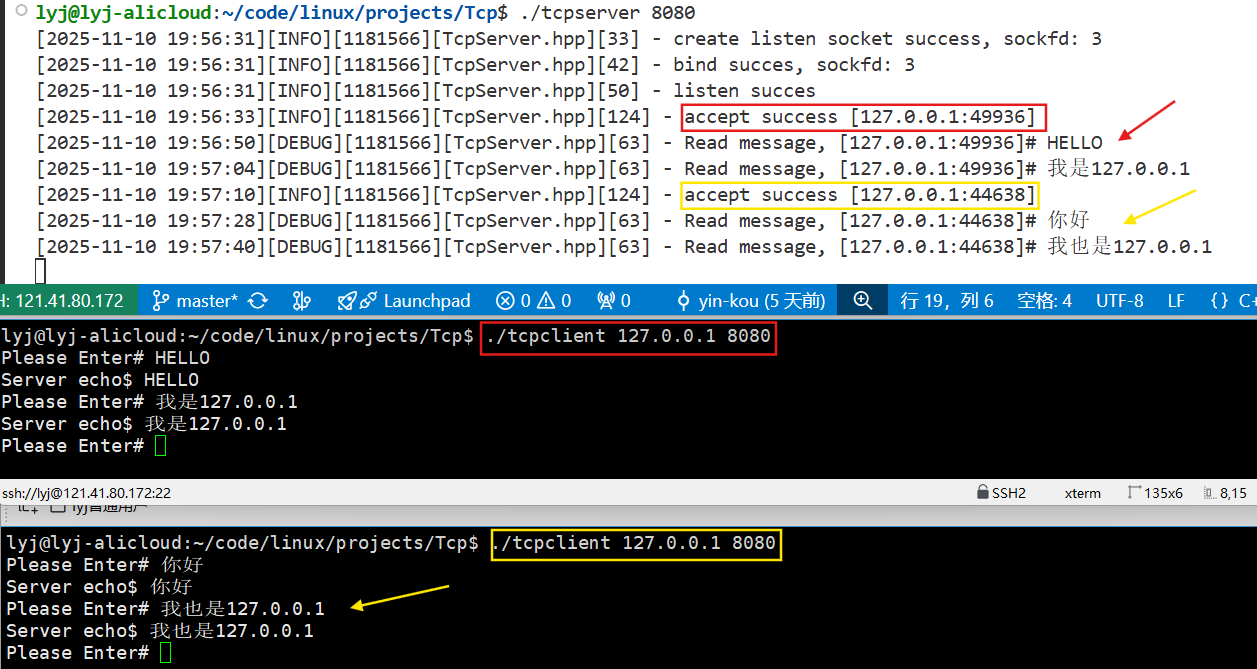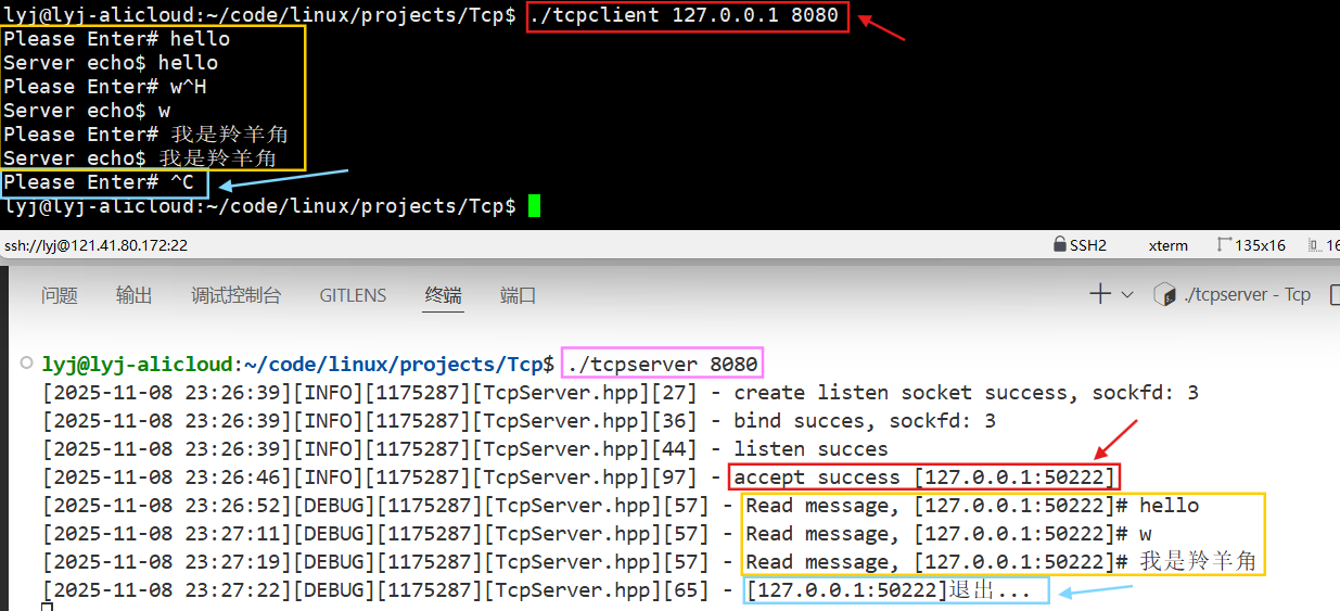 {if (argc != 3){std::cerr << "Usage: " << argv[0] << " server_ip server_port" << std::endl;exit(ExitCode::USAGE_ERR);}std::string server_ip = argv[1];uint16_t server_port = std::stoi(argv[2]);// 1.创建套接字int sockfd = socket(AF_INET, SOCK_STREAM, 0);if (sockfd < 0){std::cout << "创建socket失败" << std::endl;exit(ExitCode::SOCKET_ERR);}// 2.直接向目标服务器发起建立连接的请求InetAddr client(server_ip, server_port); // 这里要主机转网络int n = connect(sockfd, client.NetAddrPtr(), client.NetAddrLen());if (n < 0){std::cout << "connect error" << std::endl;exit(ExitCode::CONNECT_ERR);}while (true){// 3.发消息std::cout << "Please Enter# ";std::string line;std::getline(std::cin, line);write(sockfd, line.c_str(), line.size());// 4.收消息char buffer[1024];ssize_t n = read(sockfd, buffer, sizeof(buffer) - 1);if (n > 0){buffer[n] = 0;std::cout << buffer << std::endl;}}close(sockfd);return 0;