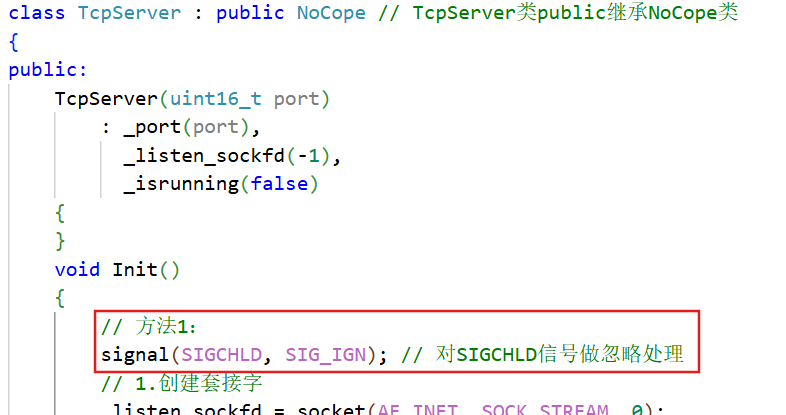 class TcpServer : public NoCope // TcpServer类public继承NoCope类