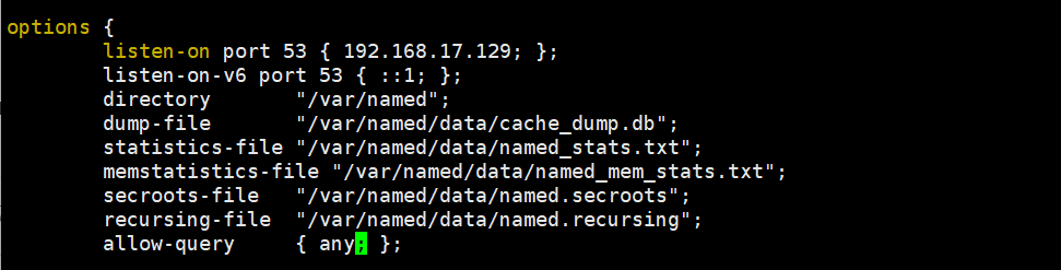 (1)通过vim /etc/named.conf 命令进入,编辑主配置文件设置监听IP