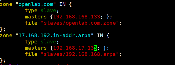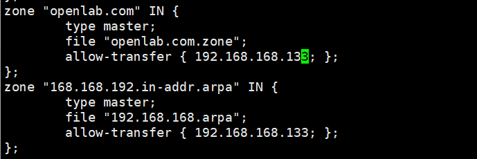 (2)通过vim /etc/named.rfc1912.zones ,打开区域配置文件,添加如下内容,重点为:允许从服务器的同步请求。
