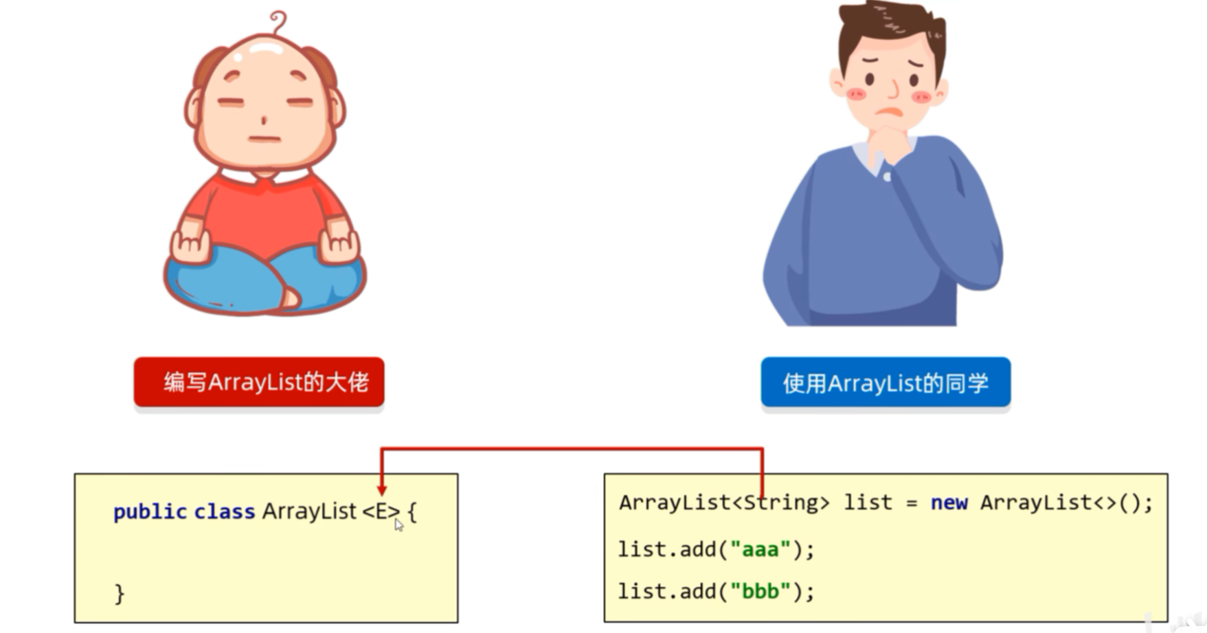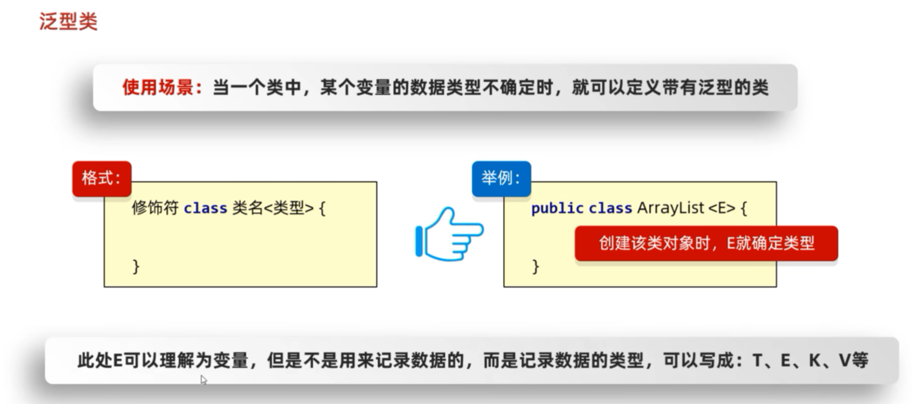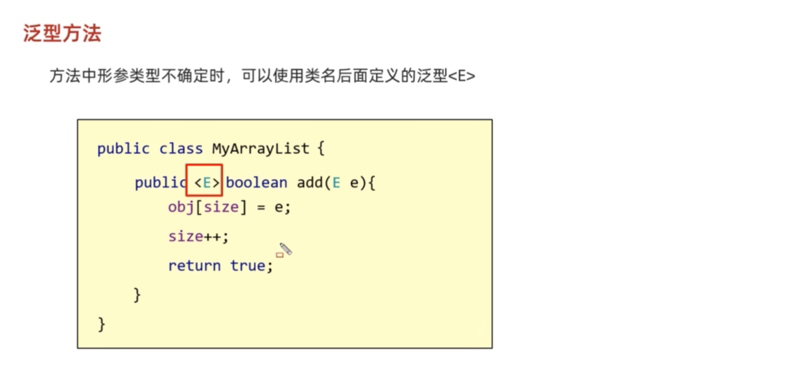 自己编写的时候,只能用<E>代表不确定是什么泛型,只用到别人调用了你写的泛型类才能确定。
