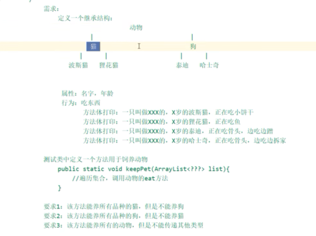 package com.lkbhua.Test.泛型类test.Text;import java.util.ArrayList;public class test {public static void main(String[] args) {/* 测试类中定义一个方法用于饲养动物:public static void keepPet(ArrayList<???> list){// 遍历集合,调用动物eat方法}需求1:该方法能养所有品种的猫,但是不能养狗需求2:该方法能养所有品种的狗,但是不能养猫需求3:该方法能养所有品种的猫和狗,但是不能传递其他的类型*/ArrayList<LiHuaCat> list1 = new ArrayList<>();ArrayList<PersianCat> list2 = new ArrayList<>();ArrayList<HuskyDog> list3 = new ArrayList<>();ArrayList<Teddy> list4 = new ArrayList<>();// 需求测试1keepPet(list1);keepPet(list2);// keepPet(list3);// keepPet(list4);// 需求测试2keepPet1(list3);keepPet1(list4);// keepPet1(list1);// keepPet1(list2);// 需求测试3keepPet2(list1);keepPet2(list2);keepPet2(list3);keepPet2(list4);}public static void keepPet(ArrayList<? extends Cat> list) {}public static void keepPet1(ArrayList<? extends Dog> list) {}public static void keepPet2(ArrayList<? extends Animal> list) {}}
