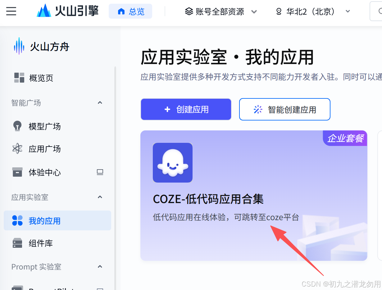 再次回到火山引擎,发现在火山方舟 -> 我的应用 里有一个 coze (扣子) 平台:
