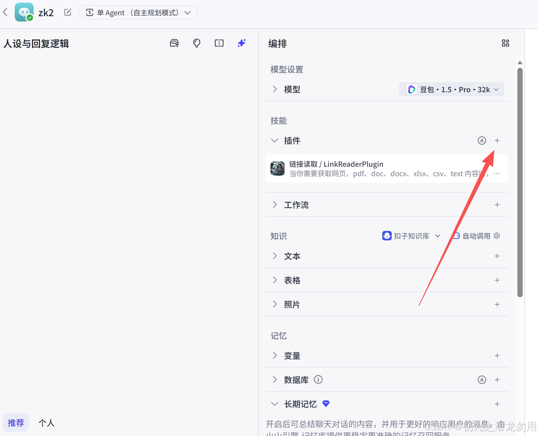 然后编辑智能体,为其添加链接解析插件,如下图: