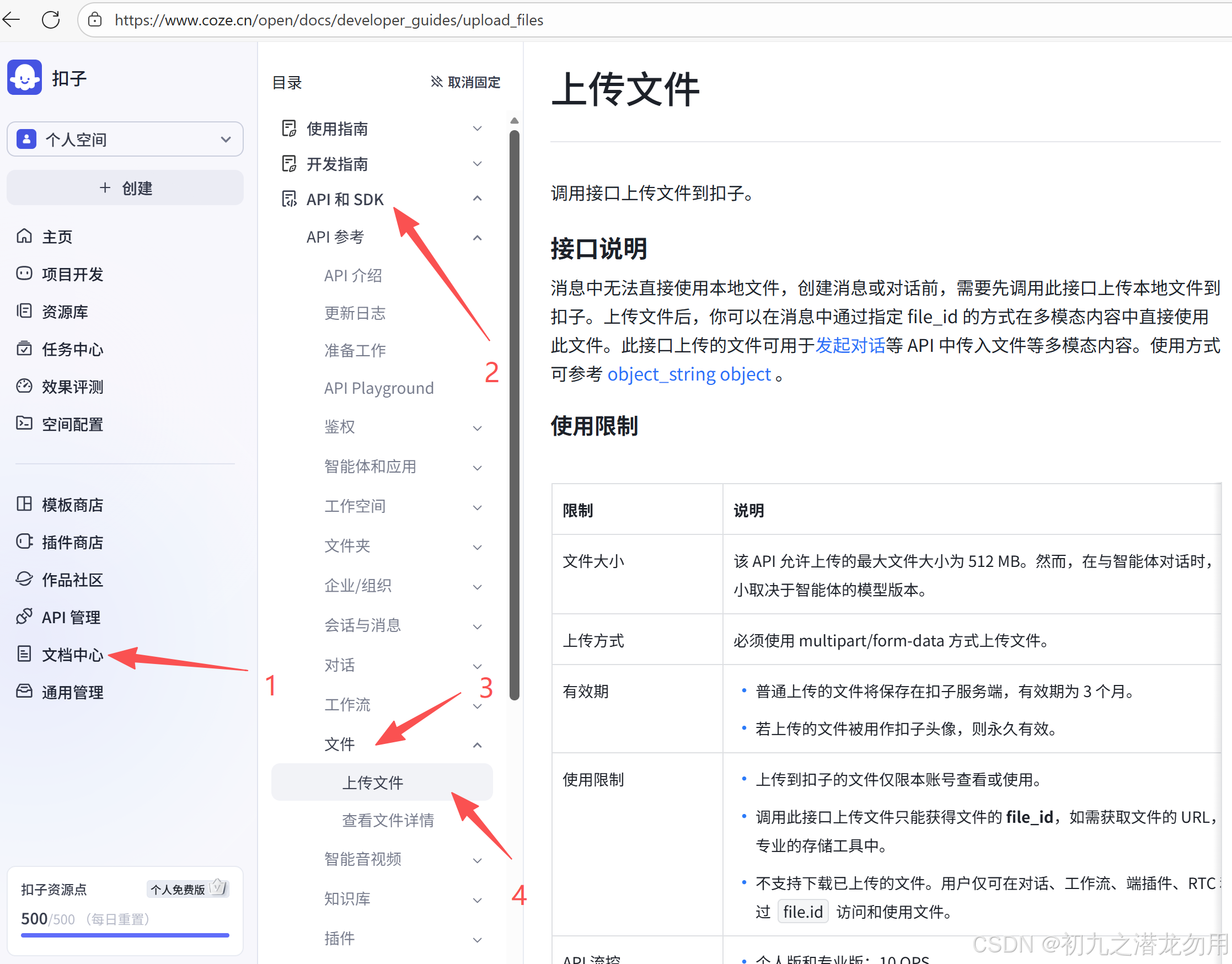 跳转到 coze 平台,根据以往“经验”,先没有着急创建应用和体验,直接点击左侧菜单栏的 文档中心 -> API 和 SDK -> 文件 -> 上传文件,终于找到了实现的支持。