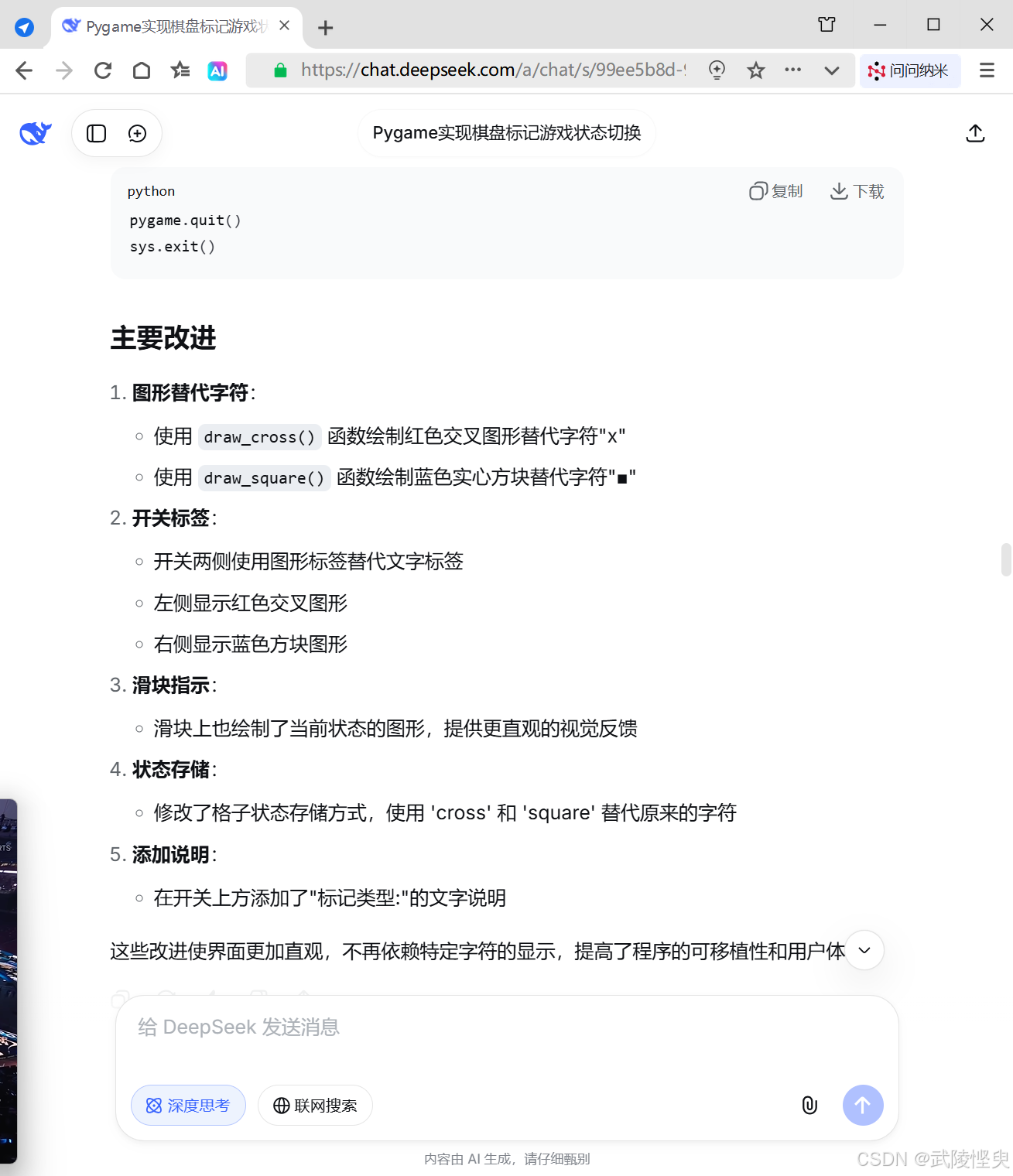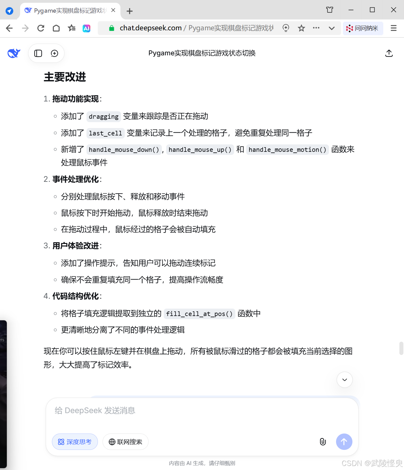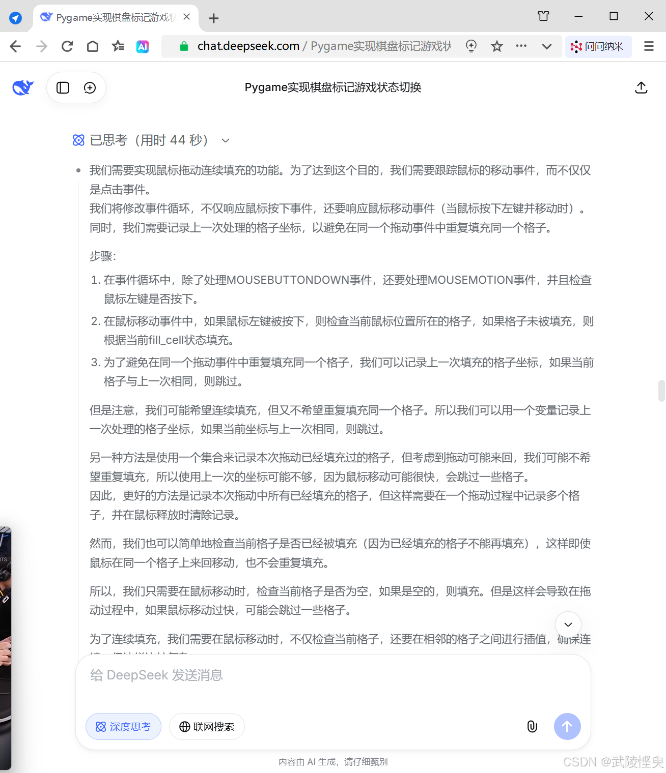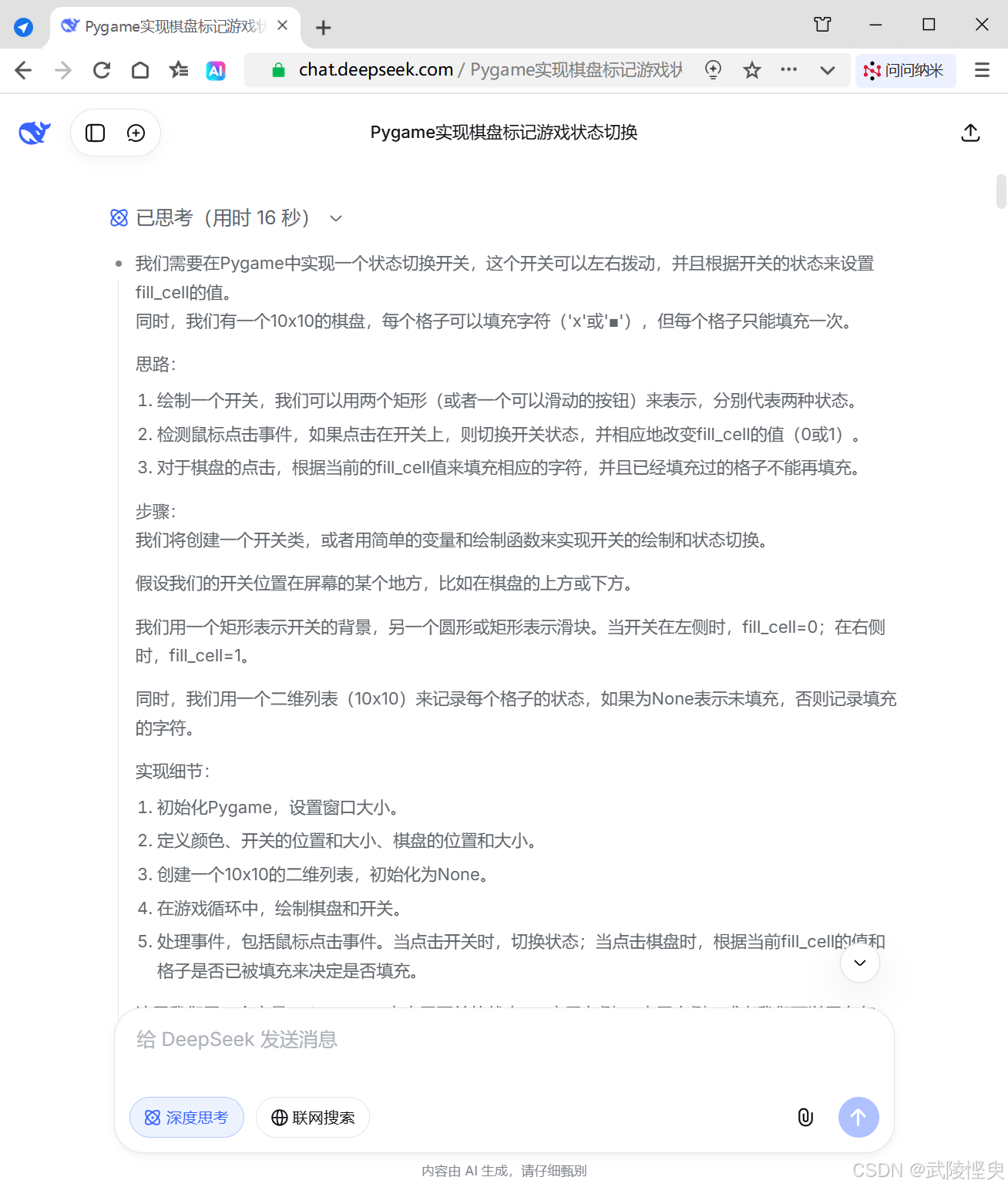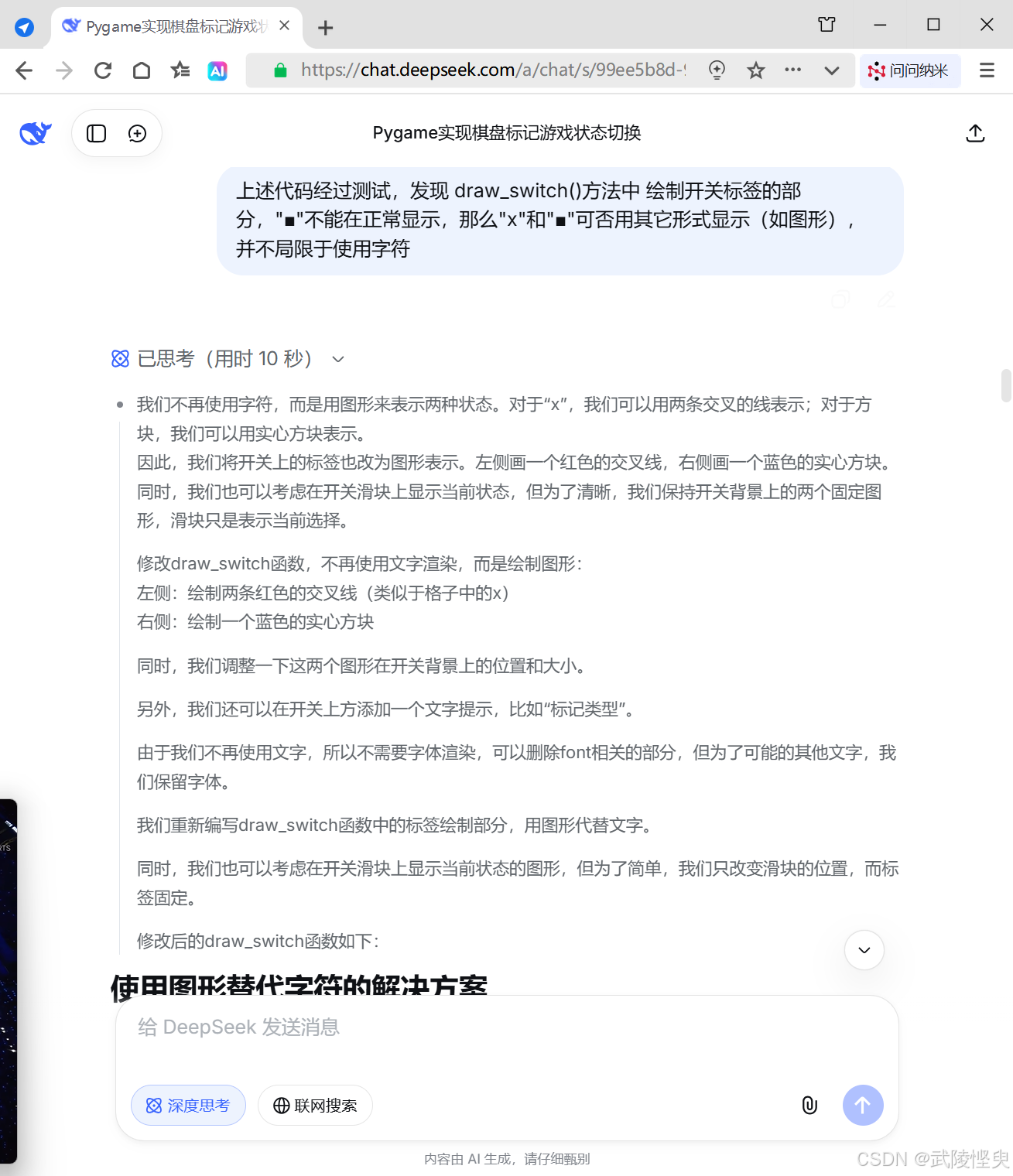 在用AI之前,我也没有把自己的需求想那么全面的。一开始只是想实现切换开关,于是,我向DeepSeek提出了如下的需求:“我用pygame开发小游戏,游戏规则是对10*10的棋盘中的格子进行标记,现在需要实现一个状态切换开关,这个开关修改变量fill_cell。当开关拨向左侧时,fill_cell = 0,此时鼠标点中格子,表示向格子内填充字符x;当开关拨向右侧时,fill_cell = 1,此时鼠标点中格子,表示向格子内填充字符■。已经填充过的格子不能再填充,请帮我实现这个功能”