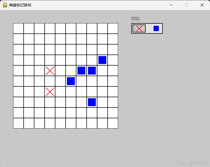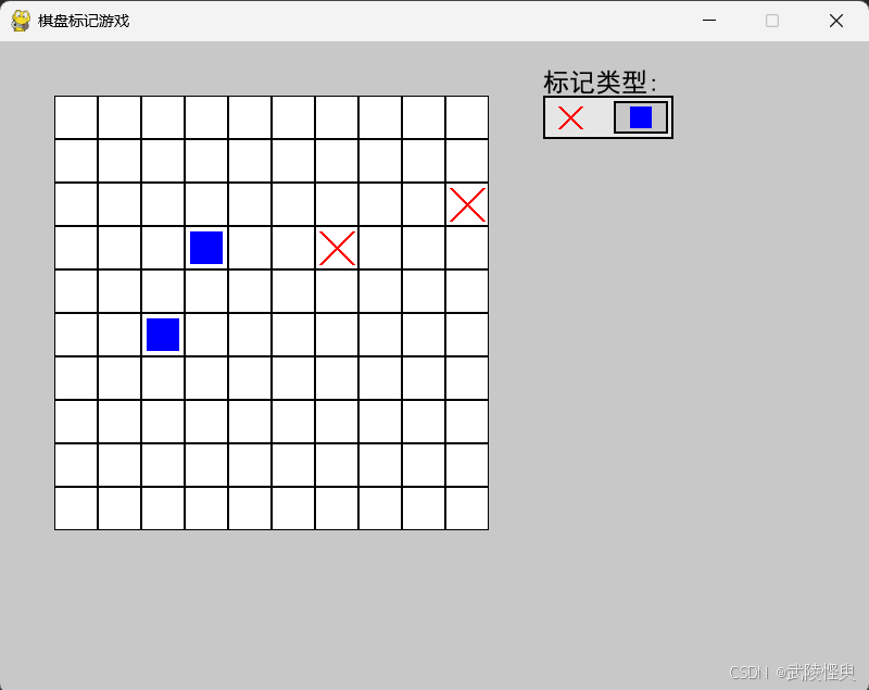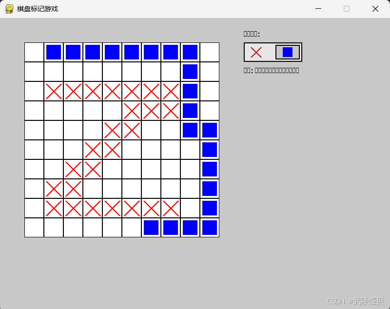 last_cell = None # 记录上一个处理的格子,避免重复处理def draw_cross(x, y, size, color):"""绘制交叉图形"""pygame.draw.line(screen, color, (x, y), (x + size, y + size), 3)pygame.draw.line(screen, color, (x + size, y), (x, y + size), 3)def draw_square(x, y, size, color):"""绘制实心方块"""pygame.draw.rect(screen, color, (x, y, size, size))def draw_grid():"""绘制棋盘"""for row in range(GRID_SIZE):for col in range(GRID_SIZE):x = GRID_OFFSET_X + col * CELL_SIZEy = GRID_OFFSET_Y + row * CELL_SIZE# 绘制格子pygame.draw.rect(screen, WHITE, (x, y, CELL_SIZE, CELL_SIZE))pygame.draw.rect(screen, BLACK, (x, y, CELL_SIZE, CELL_SIZE), 1)# 如果格子有内容,绘制内容if grid[row][col] is not None:if grid[row][col] == 'cross':# 绘制红色交叉draw_cross(x + 5, y + 5, CELL_SIZE - 10, RED)else: # 绘制蓝色方块draw_square(x + 5, y + 5, CELL_SIZE - 10, BLUE)def draw_switch():"""绘制状态切换开关"""# 绘制开关背景pygame.draw.rect(screen, LIGHT_GRAY, (SWITCH_X, SWITCH_Y, SWITCH_WIDTH, SWITCH_HEIGHT))pygame.draw.rect(screen, BLACK, (SWITCH_X, SWITCH_Y, SWITCH_WIDTH, SWITCH_HEIGHT), 2)# 绘制开关标签 - 使用图形替代字符# 左侧标签:红色交叉draw_cross(SWITCH_X + 15, SWITCH_Y + SWITCH_HEIGHT // 2 - 10, 20, RED)# 右侧标签:蓝色方块draw_square(SWITCH_X + SWITCH_WIDTH - 35, SWITCH_Y + SWITCH_HEIGHT // 2 - 10, 20, BLUE)# 绘制开关滑块if fill_cell == 0:knob_x = SWITCH_X + 5else:knob_x = SWITCH_X + SWITCH_WIDTH - SWITCH_KNOB_WIDTH - 5pygame.draw.rect(screen, GRAY, (knob_x, SWITCH_Y + 5, SWITCH_KNOB_WIDTH, SWITCH_HEIGHT - 10))pygame.draw.rect(screen, BLACK, (knob_x, SWITCH_Y + 5, SWITCH_KNOB_WIDTH, SWITCH_HEIGHT - 10), 2)# 在滑块上绘制当前状态的图形if fill_cell == 0:draw_cross(knob_x + SWITCH_KNOB_WIDTH // 2 - 10, SWITCH_Y + SWITCH_HEIGHT // 2 - 10, 20, RED)else:draw_square(knob_x + SWITCH_KNOB_WIDTH // 2 - 10, SWITCH_Y + SWITCH_HEIGHT // 2 - 10, 20, BLUE)# 添加说明文字label = font.render("标记类型:", True, BLACK)screen.blit(label, (SWITCH_X, SWITCH_Y - 25))# 添加操作提示hint = font.render("提示: 按住鼠标左键拖动可连续标记", True, BLACK)screen.blit(hint, (SWITCH_X, SWITCH_Y + SWITCH_HEIGHT + 10))def is_point_in_grid(pos):"""检查点击位置是否在棋盘内"""x, y = posreturn (GRID_OFFSET_X <= x < GRID_OFFSET_X + GRID_SIZE * CELL_SIZE andGRID_OFFSET_Y <= y < GRID_OFFSET_Y + GRID_SIZE * CELL_SIZE)def get_grid_cell(pos):"""获取点击位置对应的格子坐标"""x, y = poscol = (x - GRID_OFFSET_X) // CELL_SIZErow = (y - GRID_OFFSET_Y) // CELL_SIZEreturn row, coldef is_point_in_switch(pos):"""检查点击位置是否在开关内"""x, y = posreturn (SWITCH_X <= x < SWITCH_X + SWITCH_WIDTH andSWITCH_Y <= y < SWITCH_Y + SWITCH_HEIGHT)def toggle_switch():"""切换开关状态"""global fill_cellfill_cell = 1 - fill_cell # 在0和1之间切换def fill_cell_at_pos(pos):"""在指定位置填充格子"""global last_cellif is_point_in_grid(pos):row, col = get_grid_cell(pos)# 检查是否是新的格子if (row, col) == last_cell:returnif 0 <= row < GRID_SIZE and 0 <= col < GRID_SIZE and grid[row][col] is None:if fill_cell == 0:grid[row][col] = 'cross'else:grid[row][col] = 'square'# 更新最后处理的格子last_cell = (row, col)def handle_mouse_down(pos):"""处理鼠标按下事件"""global dragging, last_cellif is_point_in_switch(pos):toggle_switch()elif is_point_in_grid(pos):dragging = Truelast_cell = None # 重置最后处理的格子fill_cell_at_pos(pos) # 填充当前格子def handle_mouse_up():"""处理鼠标释放事件"""global dragging, last_celldragging = Falselast_cell = None # 重置最后处理的格子def handle_mouse_motion(pos):"""处理鼠标移动事件"""if dragging and is_point_in_grid(pos):fill_cell_at_pos(pos)# 主游戏循环