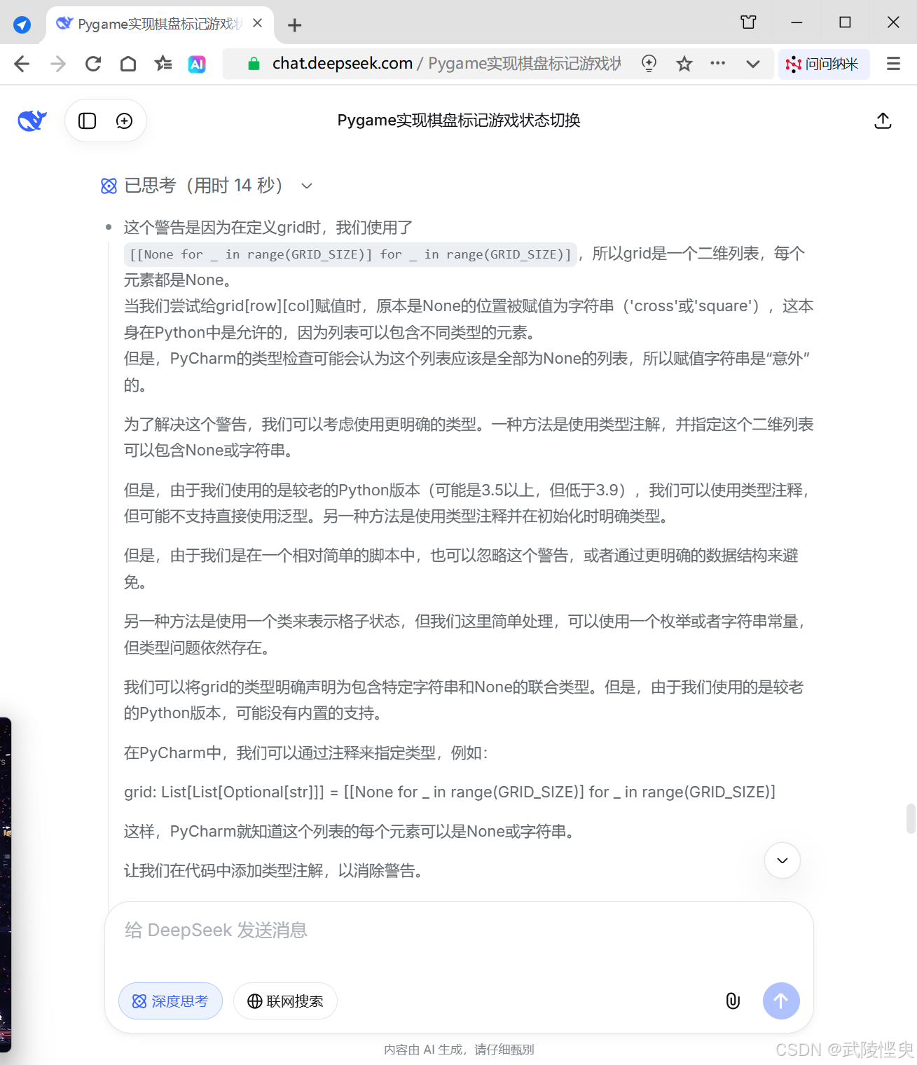 是针对grid[row][col]二维列表的,这个二维列表是用来存储每个格子填充的内容的。虽然这个问题不影响程序的运行,我还是问了一下DeepSeek:“你提供的代码中语句 grid[row][col] = 'cross' 和 grid[row][col] = 'square' 被pycharm警告,警告信息是:意外类型:(int | Any, str)可能的类型:(SupportsIndex, None)(slice, Iterable[None]) ,这是怎么回事?”