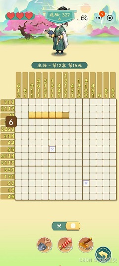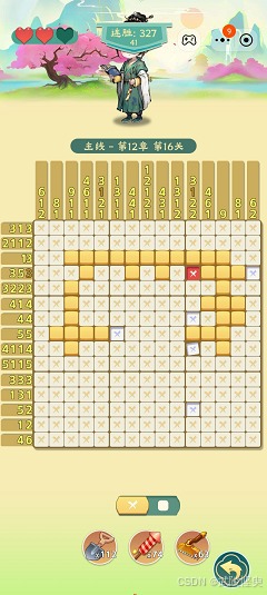 我要模仿的这款游戏的玩法是根据数字提示在棋盘中填充叉或方块。在棋盘的下方有一个切换开关,可以在叉和方块直接进行切换。切换到左边的叉,就能在棋盘中填充叉(代表空格),切换到右边的方块,就能在棋盘中填充方块(代表实心格)。另外,该游戏是款手游,是支持手指滑动进行连续填充的。