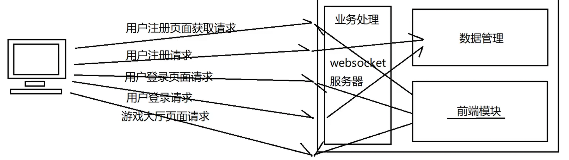 我们要实现的是一个在线五子棋对战服务器,提供用户通过 浏览器进行用户注册,登录,以及实时匹配,对战,聊天等功能;所以若宏观的分,可以分为三大块,数据管理模块,前端界面模块与业务处理模块;