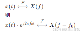 频谱搬移:这是该特性的核心作用。一个信号的频谱X(f) 会被整体搬移到以 f0 为中心的位置。