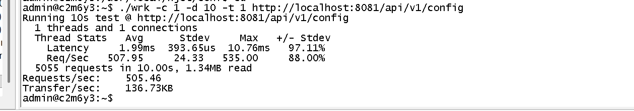 Running 1m test @ http://localhost:8081/api/v1/config1 threads and 1 connectionsThread Stats Avg Stdev Max +/- StdevLatency 119.09us 212.75us 7.30ms 98.51%Req/Sec 10.12k 1.12k 12.62k 67.05%604889 requests in 1.00m, 101.53MB read Requests/sec: 10064.84 Transfer/sec: 1.69MB本地测试提高了约500倍,在虚拟机等各种不同的环境也有百倍以上的性能提升,满足了消息服务器等各种跨进程通信的性能需求
