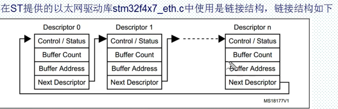在 ST 提供的以太网驱动库 stm32f4x7_eth.c 中使用的是链接结构,链接结构如下: